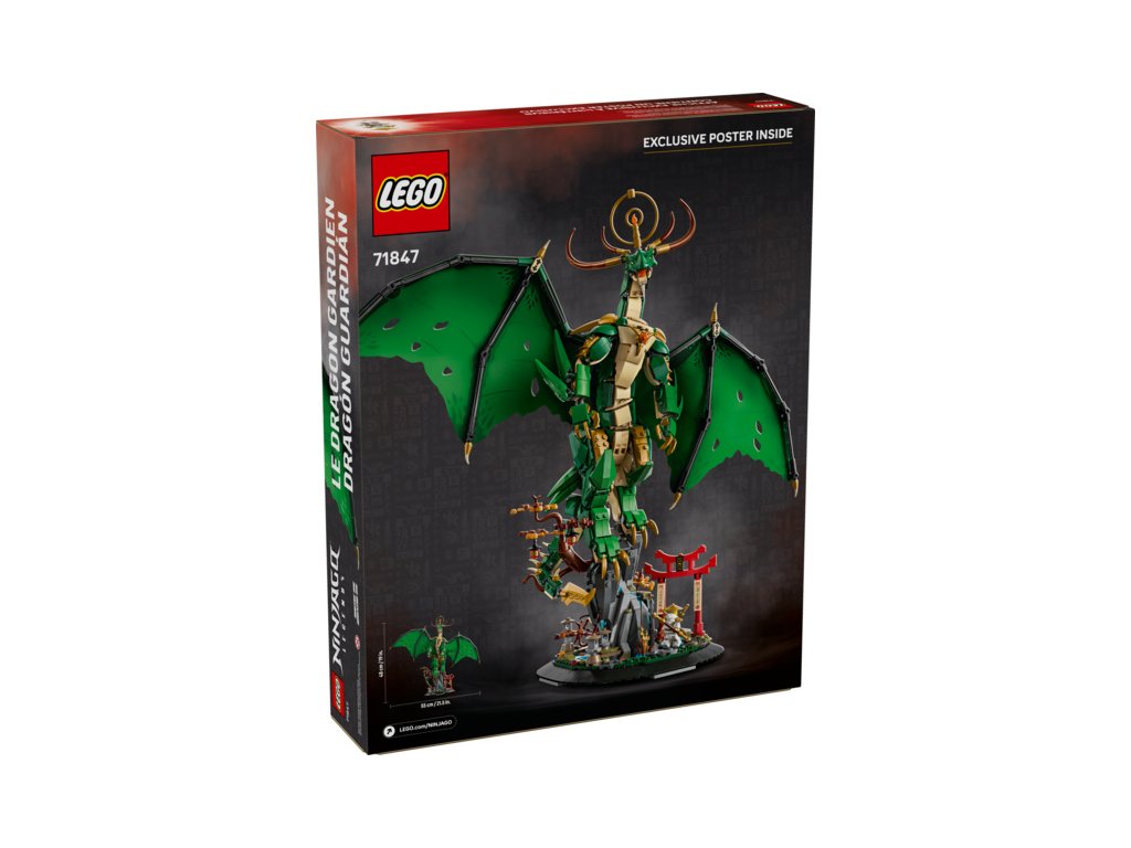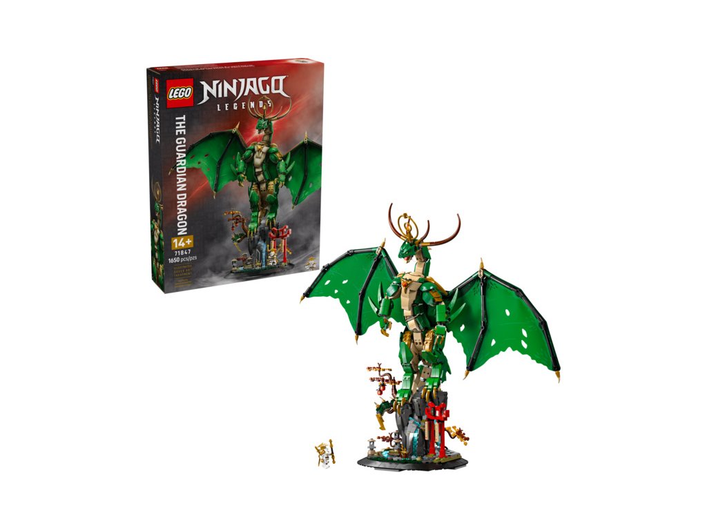 Starší fanoušci NINJAGO® od 14 let můžou rozšířit svou sbírku modelů LEGO® NINJAGO o majestátní stavebnici Strážný drak (71847). Tento výstavní model draka má pohyblivou hlavu, paže a šupiny a nechybí velká křídla, ostny a svatozář nad hlavou, takže poslouží jako krásný dárek pro fanoušky seriálu NINJAGO Legends Monstrosity.