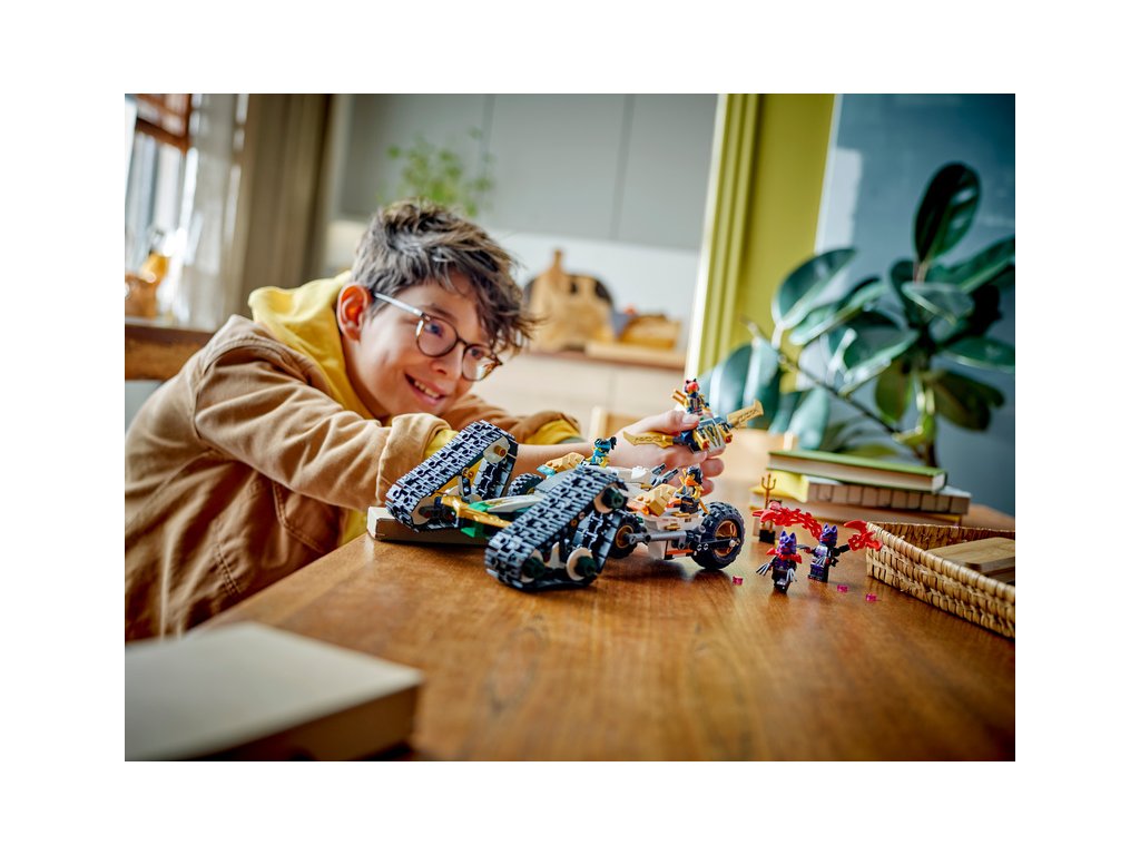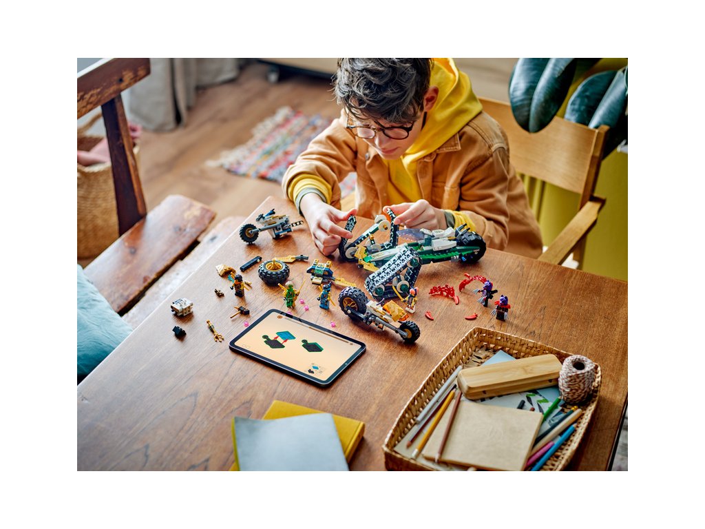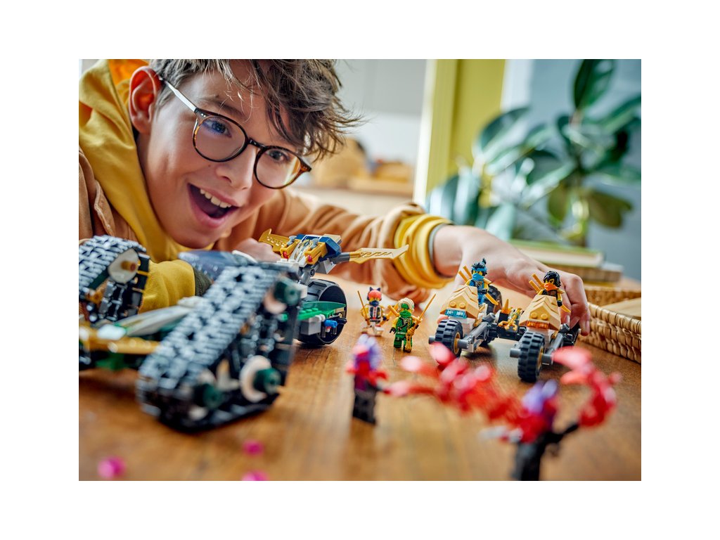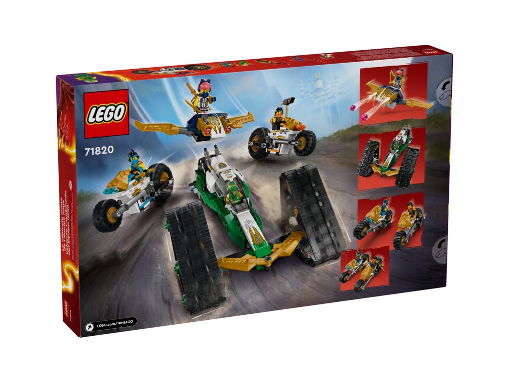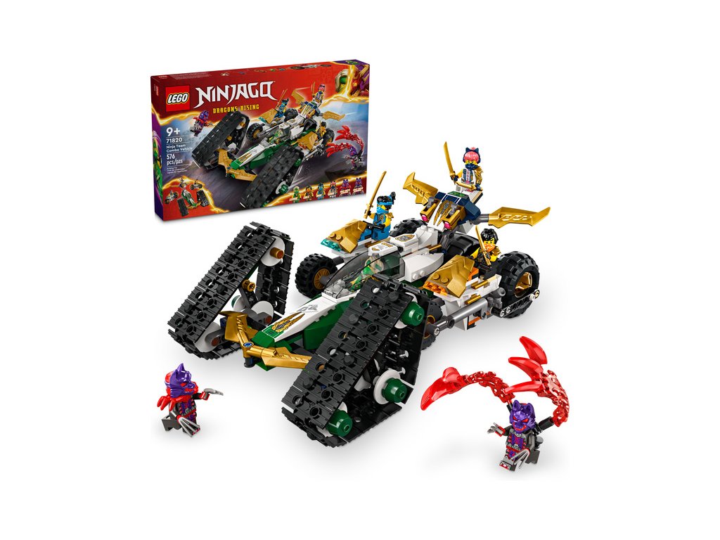 Kluci a holky od 9 let si užijí akční dobrodružství z 2. řady televizního seriálu NINJAGO® Dračí povstání se stavebnicí Tým nindžů a kombo vozidlo (71820) 4 v 1. Děti se mohou těšit na velkou porci zábavy při hraní velkým akčním modelem NINJAGO, který pak rozdělí na 4 menší vozidla: Sorin kluzák se 2 vystřelovači, Lloydův terénní závoďák a motorky Colea a Nyi.