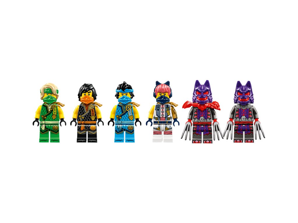 - 6 minifigurek NINJAGO® – Nindžovská stavebnice obsahuje nindži Soru, Lloyda, Nyu a Colea, válečníka s vlčí maskou a generála ve vlčí masce