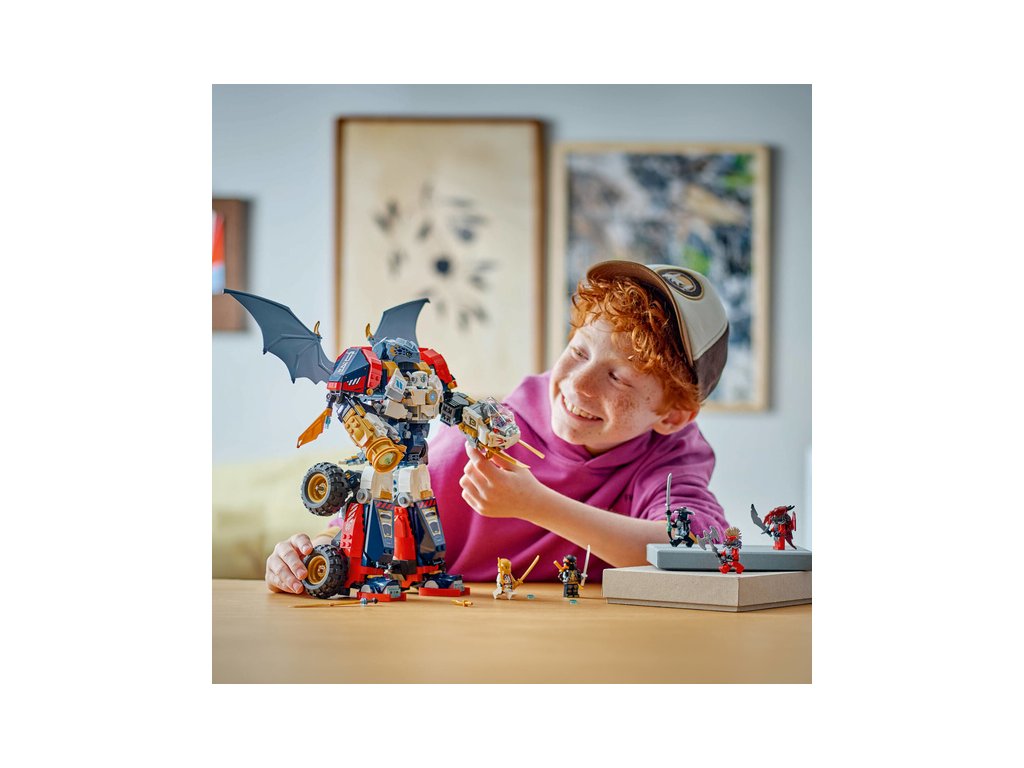 - Pohyblivá stavebnice NINJAGO® – Velký kombo robot má pohyblivé nohy, chodidla, paže, zápěstí, prsty a hlavu, a navíc dračí křídla, kokpit, 2 vystřelovače a velký meč