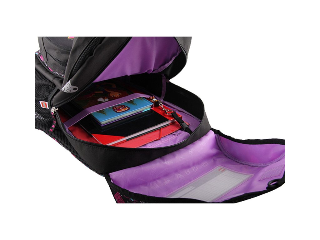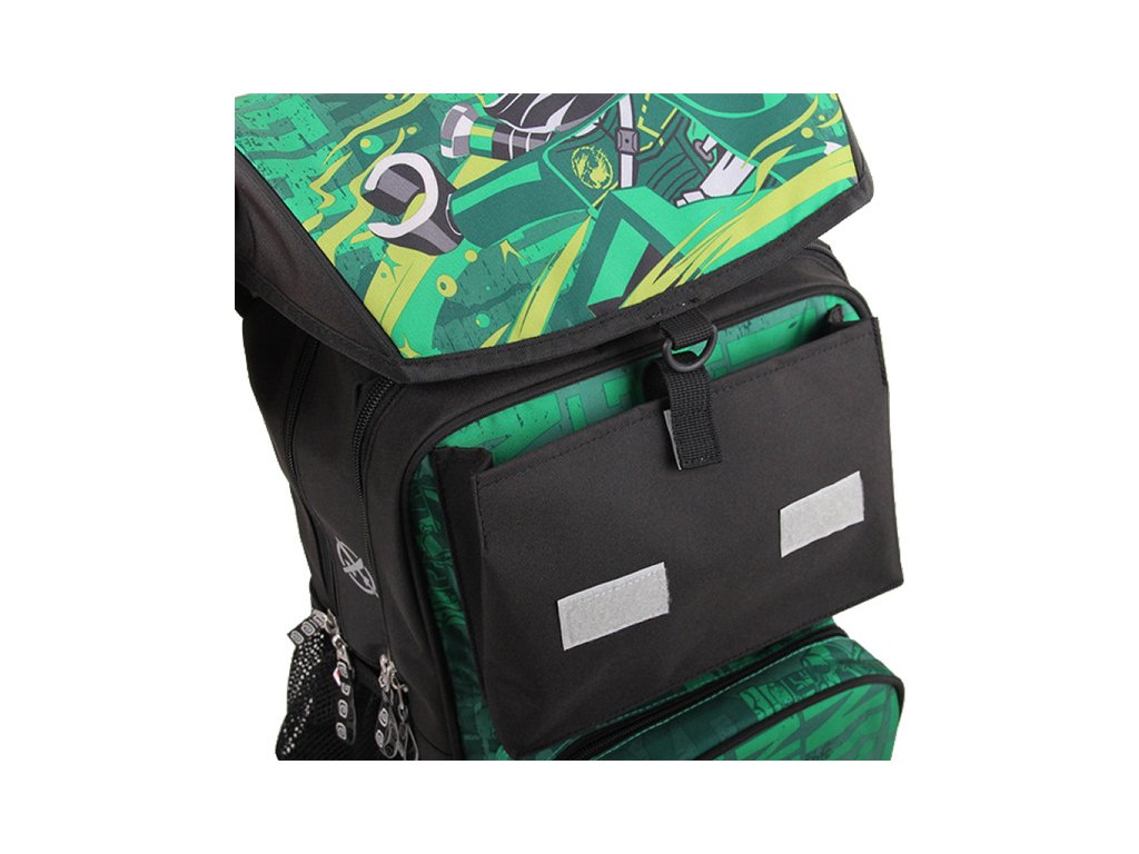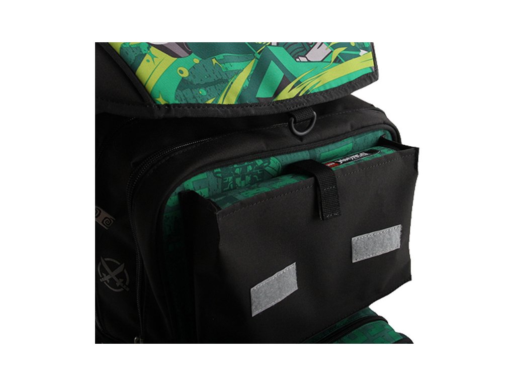 - Pod klopou na suchý zip je speciální kapsa na penál a 2 velké kapsy na zip