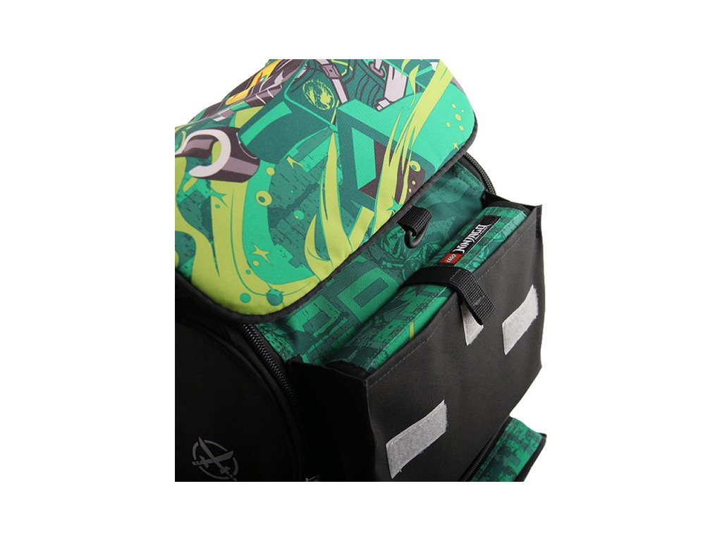 - Pod klopou na suchý zip je speciální kapsa na penál a hlavní kapsa na zip.
