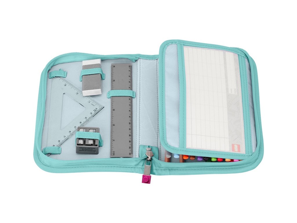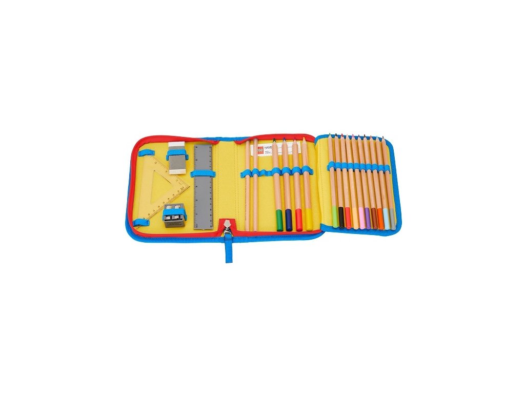Pouzdro s náplní a motivem LEGO obsahuje všechny potřebné psací potřeby do školy. Pouzdro je dodáváno s: 2 grafitové tužky, 10 barevných pastelek, 4 široké barevné pastelky, guma, ořezávátko, rovné a trojúhelníkové pravítko. Rozměry: 14 x 20 x 4 cm, objem: 0,5 litru.