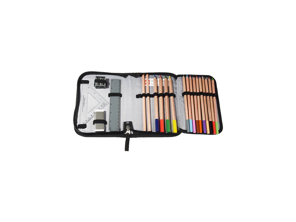 - Náplň: 2 tužky, 10 pastelek, 4 široké pastelky, guma na gumování, ořezávátko, 2 pravítka.