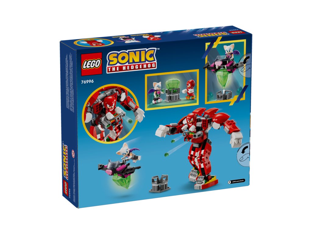 Fanoušci Sonica a děti od 8 let se mohou těšit na veselá dobrodružství se stavebnicí LEGO® Sonic the Hedgehog™ (76996) Knuckles a jeho robotický strážce. Sada je inspirována příběhy Sonica a dalších postav z této série videoher. Děti mohou Knucklesovi a Rouge vymyslet bezpočet úkolů, zatímco skládají stavebnici, a poté přehrávat napínavé scény s krádeží velkého smaragdu s kluzákem a opětovné záchrany s pomocí robota.
