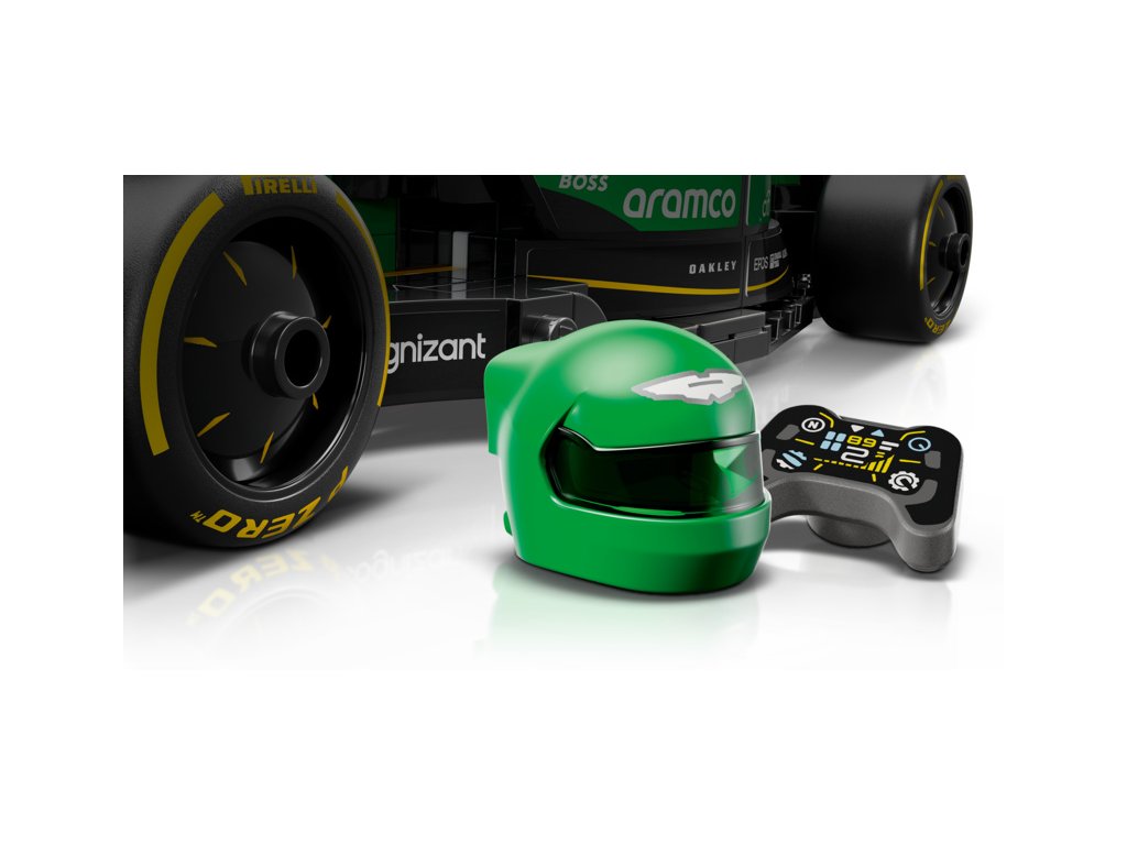- 1 minifigurka – Tato stavebnice vozidla obsahuje minifigurku řidiče v kostýmu Aston Martin Aramco F1® a okřídlenou helmu, kterou děti usadí do kokpitu a vydají se s ní na napínavé závody