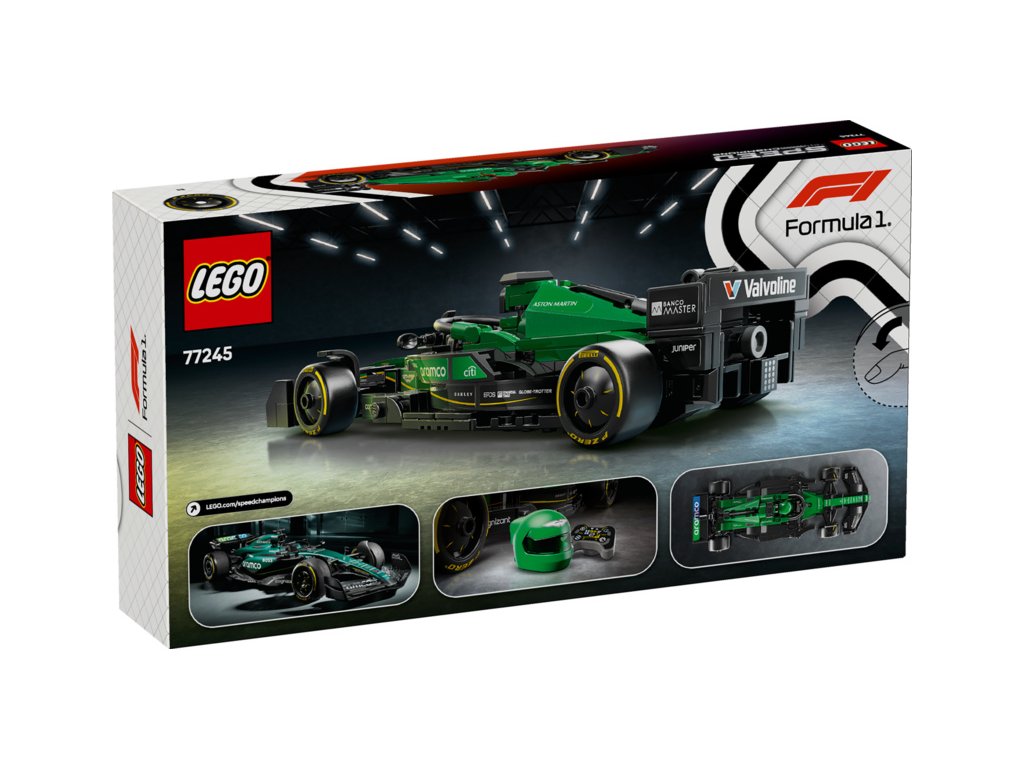 Závodní auto Aston Martin Aramco F1 má kokpit, který lze otevřít zvednutím svatozáře, zadní křídlo, rovnoběžníkovou nápravu, polepy sponzorů a širší zadní pneumatiky s nápisem „Pirelli“. Součástí stavebnice je také minifigurka jezdce v outfitu Aston Martin Aramco F1 s okřídlenou helmou, kterou můžete umístit do kokpitu a šlápnout na plyn.