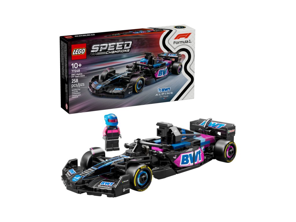 Kluci a holky od 10 let, kteří mají rádi závody Formule 1, se můžou těšit na hodiny závodění se stavebnicí LEGO® Speed Champions (77248) Závodní auto BWT Alpine F1® Team A524. Děti i dospělí sběratelé aut si postaví a vystaví závodní model auta F1, které se pyšní designovými prvky inspirované skutečným vozem, který soutěžil v Mistrovství světa Formule 1 v roce 2024.