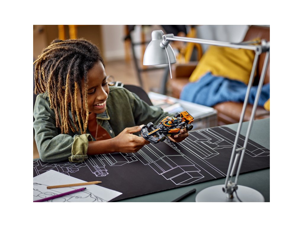 Model vozu McLaren se pyšní realistickými detaily: Papájovo-černým barevným provedením, logy sponzorů týmu, koly s potisky Pirelli a papájovou svatozáří. Součástí je také minifigurka řidiče, kterou děti usadí za volant a pustí se s ní do akčního závodění.