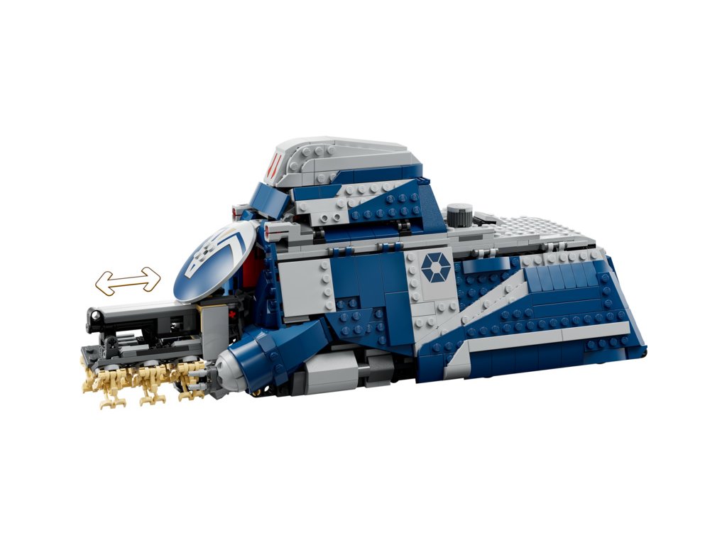 - Autentické detaily – Otočením knoflíku na horní straně MTT aktivujete stojan s droidy, který vyjede z předního poklopu. Bitevní droidy pak z držáku odepněte