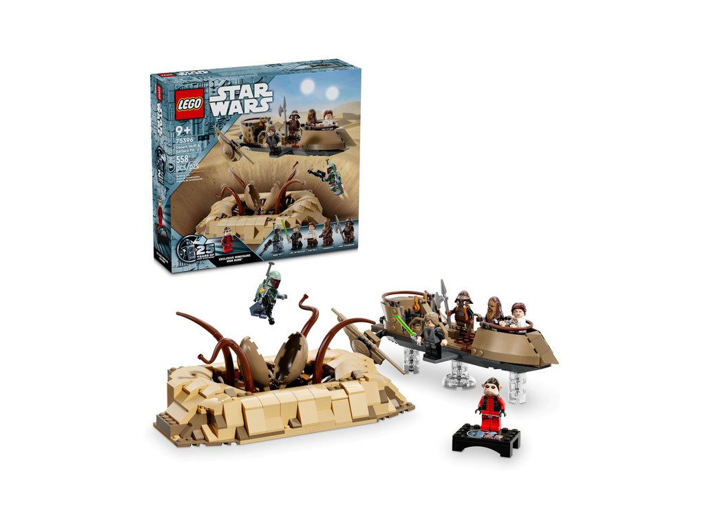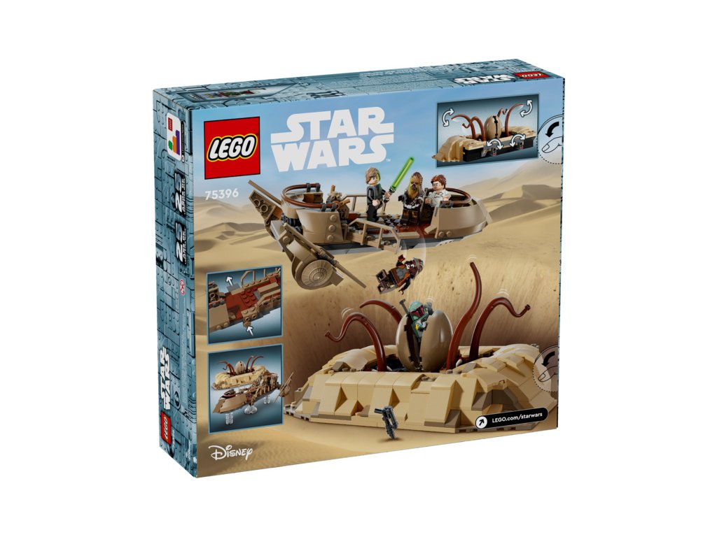 - Sestavitelné vozidlo LEGO® Star Wars™ – Pouštní skif má průsvitné dílky pro efekt vznášení, prkno, po kterém může chodit Luke Skywalker, a zábradlí, ze kterého málem spadl Han Solo