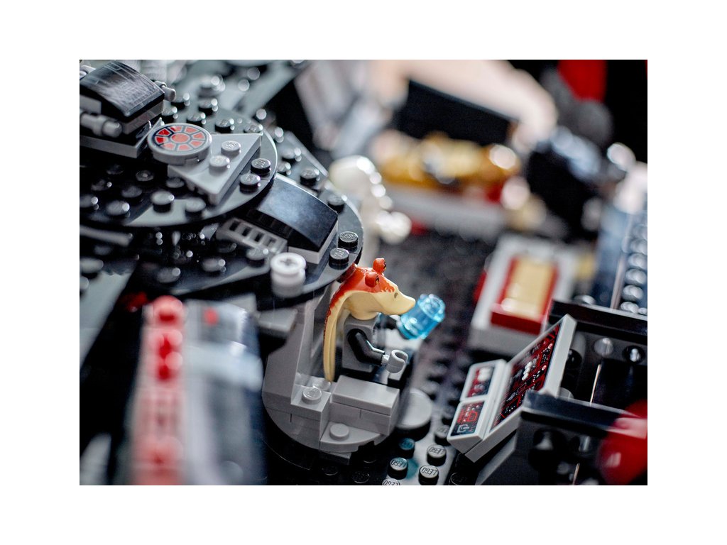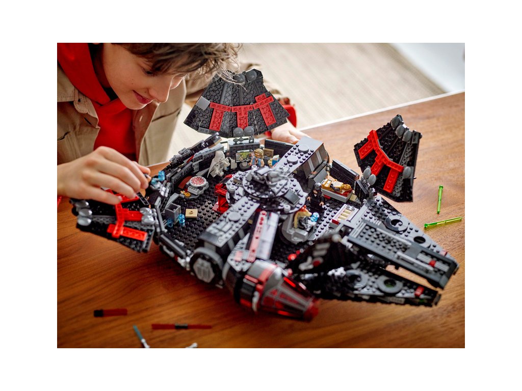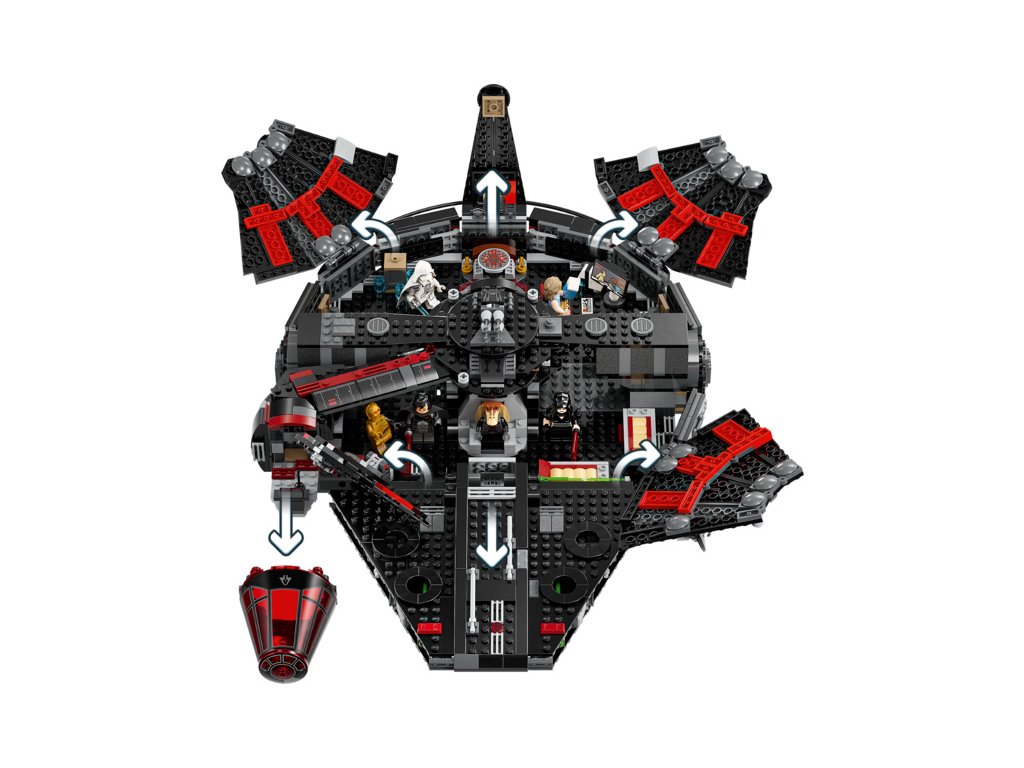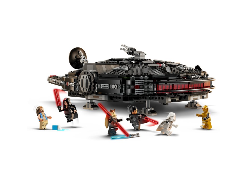 - Temný Falcon z kostek LEGO® – Součástí je odnímatelný kokpit pro 2 minifigurky LEGO, 2 pružinové vystřelovače, 2 otočná děla, střelecké stanoviště pro 2 minifigurky LEGO a satelitní talíř