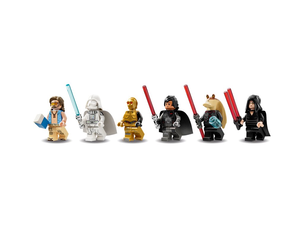 - 6 minifigurek LEGO® Star Wars™ – Darth Jar Jar, lovec odměn C-3PO, Darth Dev, Darth Rey, Luke na pláži a Jedi Vader, a navíc doplňky včetně světelných mečů a krabice modrého mléka
