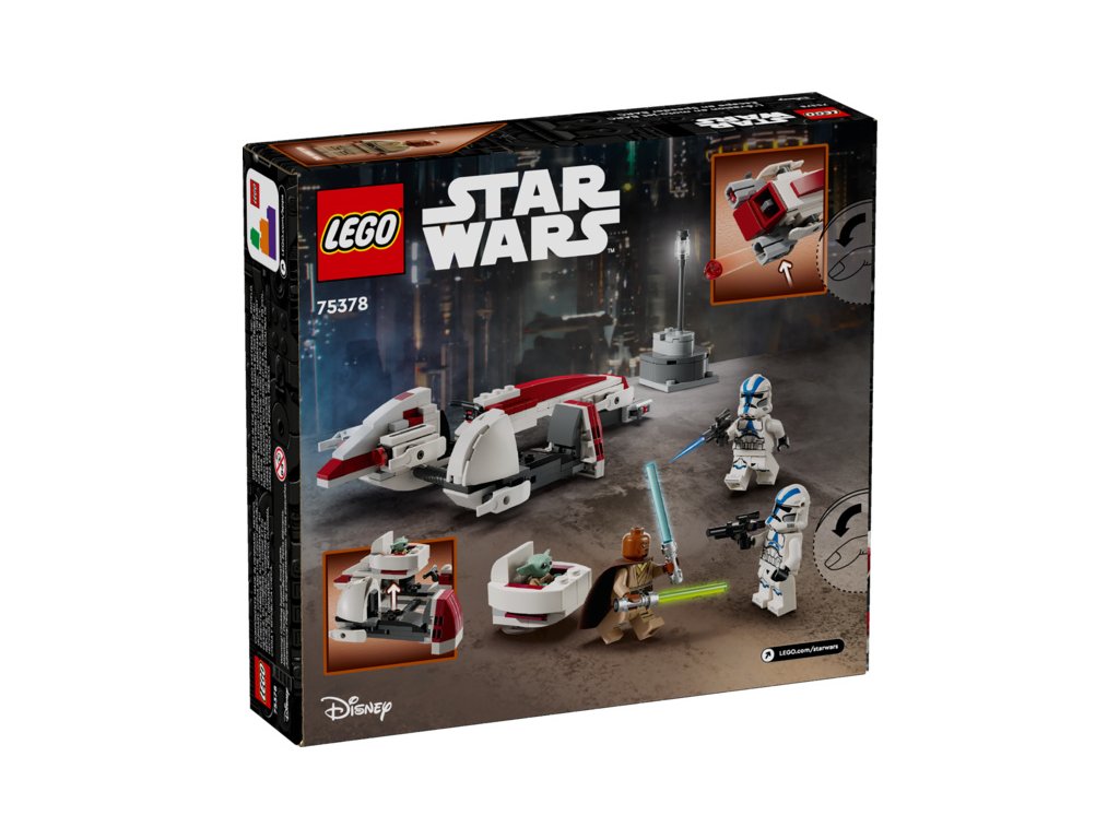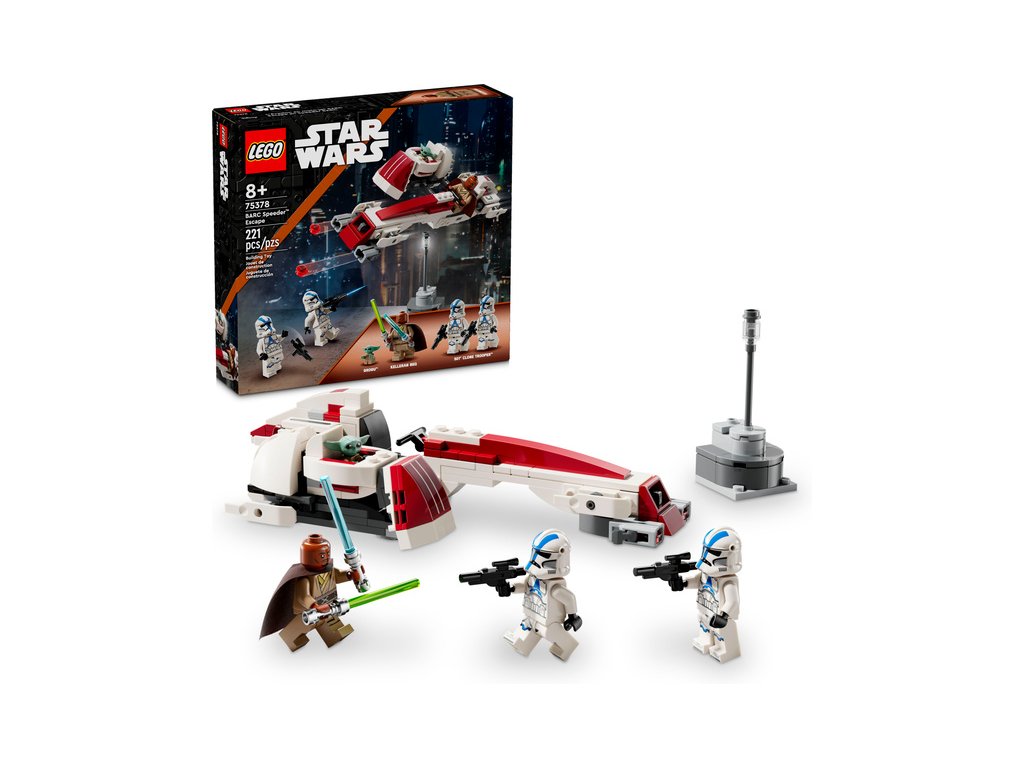 Připomeňte si scénu Útěku na spídru BARC z 3. řady seriálu Star Wars: The Mandalorian s touto jedinečnou stavebnicí LEGO® Star Wars™ (75378). Model představuje skvělý dárek pro děti, fanoušky a sběratele Star Wars od 8 let a najdete v něm spídrovou motorku s postranním vozíkem z kostek LEGO. Součástí spídru je kokpit pro minifigurku a 2 vystřelovače a do odnímatelného postranního vozíku lze připojit vznášející se kočárek Grogua. Ve stavebnici také najdete malý model scenérie a 3 minifigurky LEGO: Kellerana Beqa s modrým a zeleným světelným mečem a 2 klonované vojáky z 501. legie s blastery, a navíc figurku LEGO Grogua (kterého fanoušci někdy označují jako malého Yodu), se kterými se můžete těšit na kreativní hru plnou akce.
