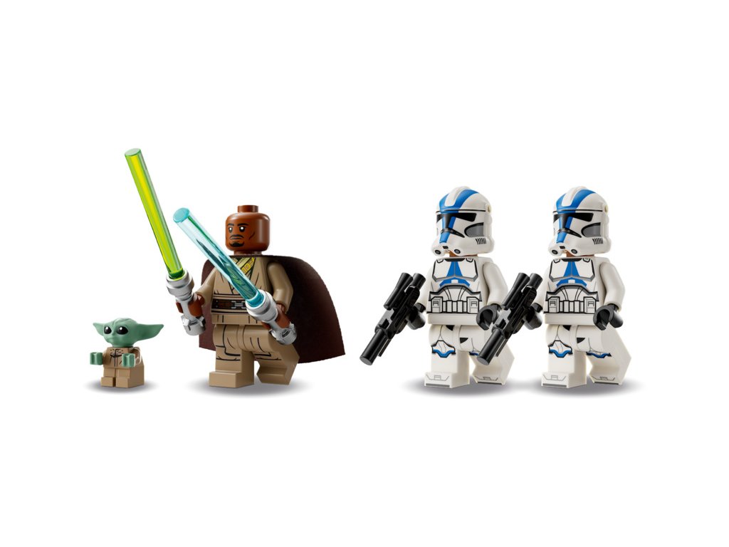 - 3 minifigurky LEGO® Star Wars™ a Grogu – Kelleran Beq s modrým a zeleným světelným mečem, 2 klonovaní vojáci z 501. legie s blastery a figurka LEGO Grogua
