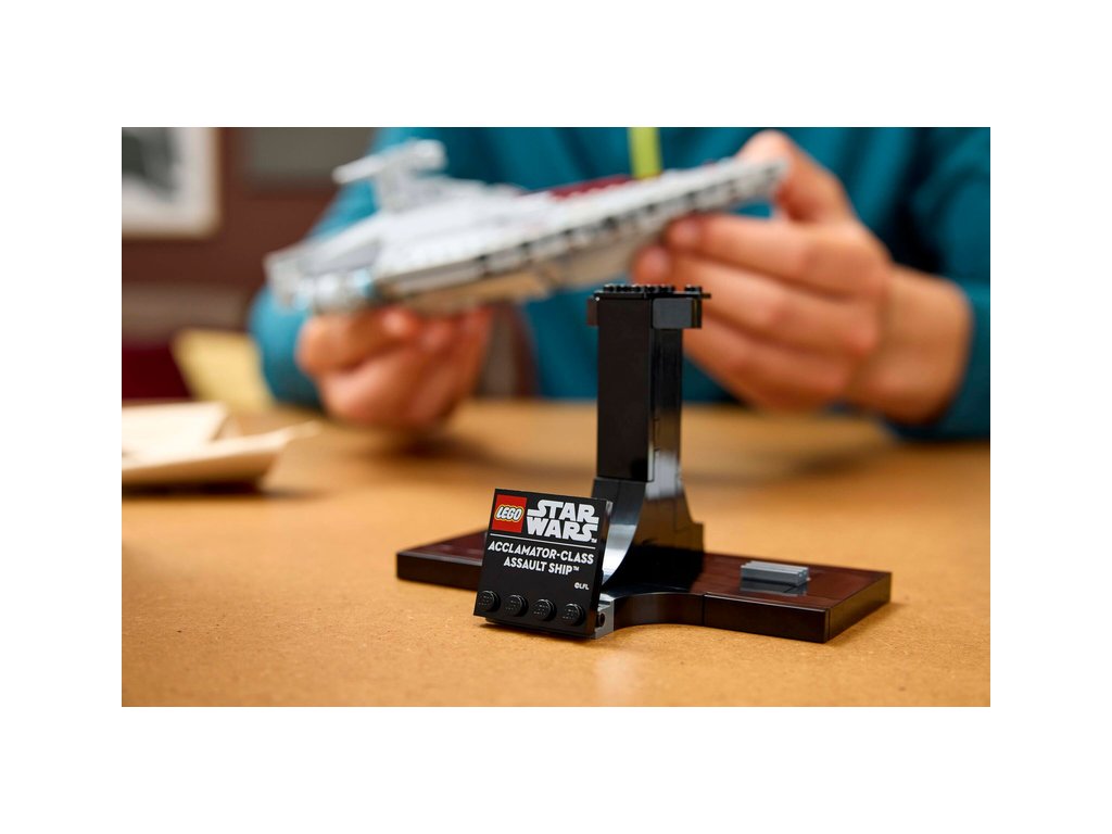 - Postavte a vystavte si model vesmírné lodi – Připomeňte si dramatické scény bitvy o planetu Geonosis a postavte si model LEGO® Star Wars Útočné lodě třídy Acclamator ve střední velikosti