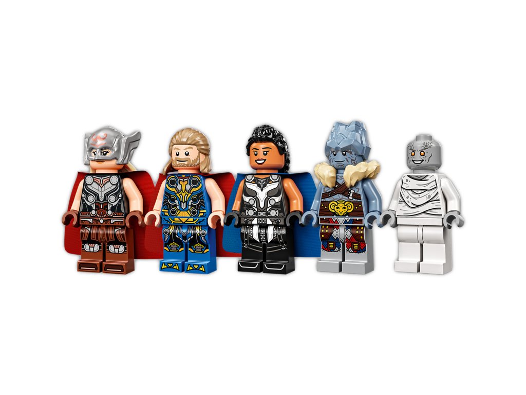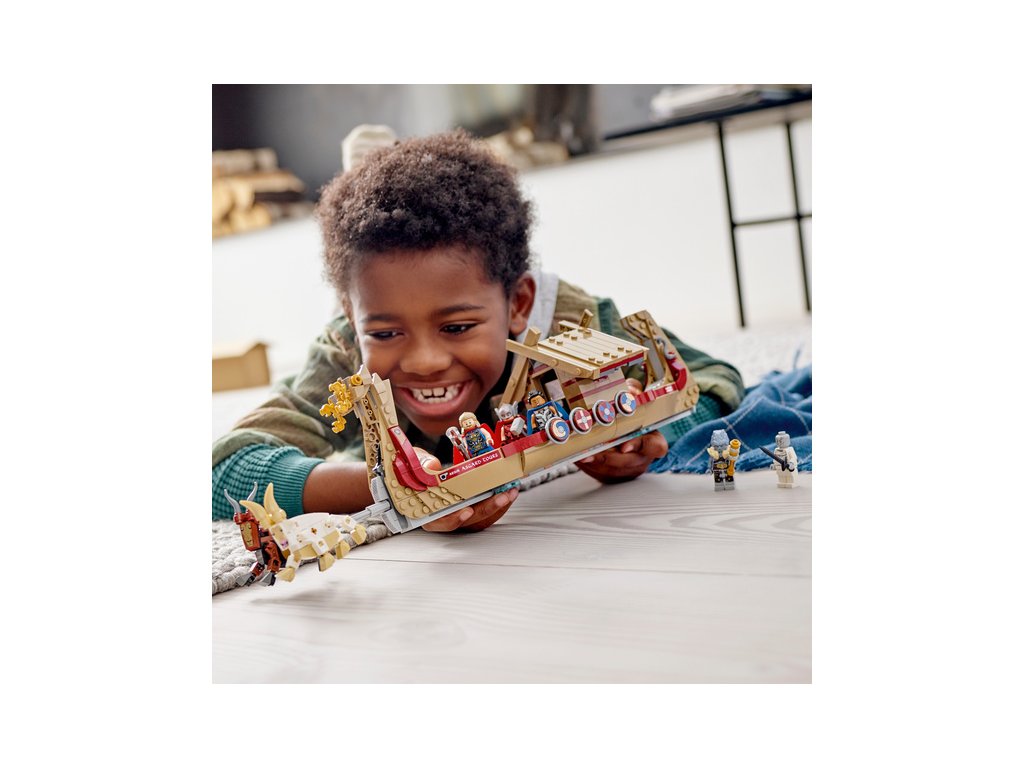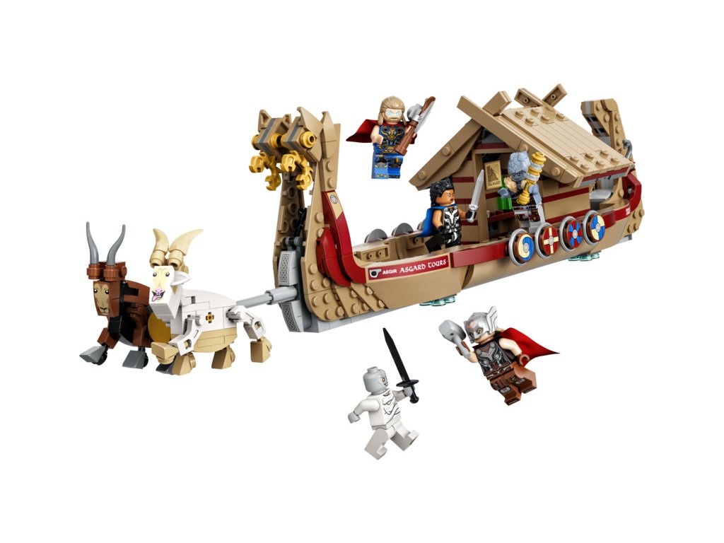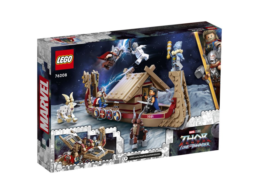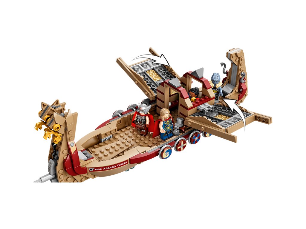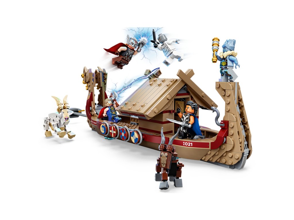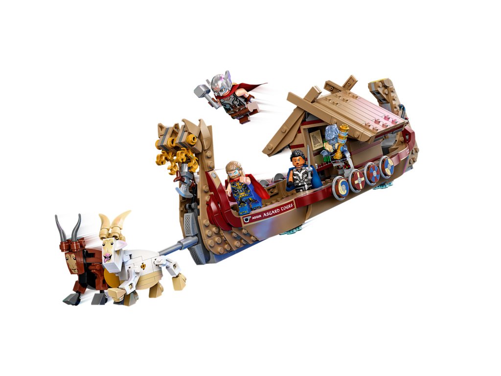 Loď po obloze táhne legendární kozí dvojice Toothgnasher a Toothgrinder, která je umístěna nad zemí, takže děti mohou s lodí při hraní pohodlně manipulovat. Stavebnice obsahuje 5 minifigurek – Thora, mocného Thora, Valkýru, Korga a Gorra – a řadu zbraní a doplňků, mezi kterými nechybí Thorova sekera Stormbreaker. Kajuta má otevírací střechu, díky čemuž děti získají přístup dovnitř. Těšit se můžete i na množství autentických doplňků pro ještě nápaditější hraní, jako lodní klíč, hasicí přístroj, mapu Nového Asgardu, láhev a sluneční krystal. Až budou všechna superhrdinská dobrodružství u konce, mohou si děti model lodi vystavit v pokojíčku. A pokud máte chuť zažít ještě větší porci stavitelské zábavy, v bezplatné aplikaci LEGO s návody na stavění najdete intuitivní digitální nástroje umožňující otáčení a přibližování modelů.