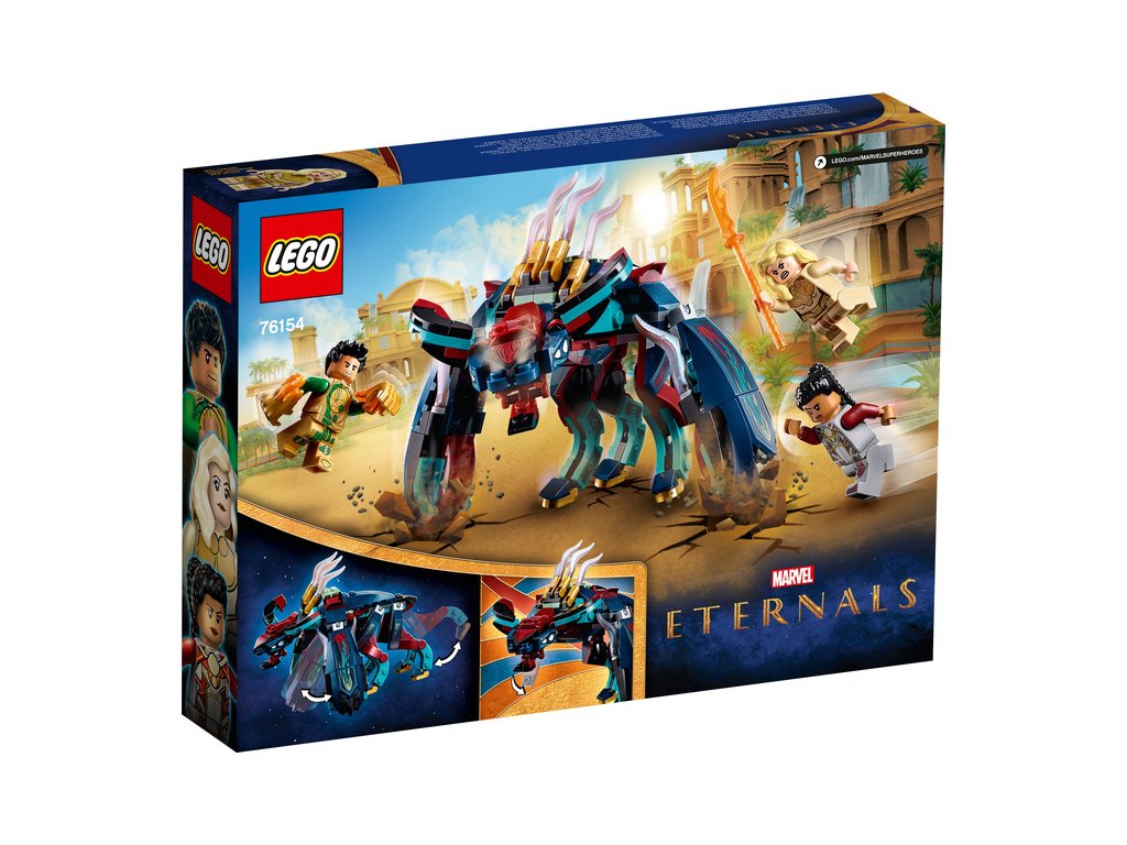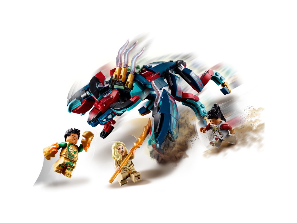 Když 6nohý Deviant s chňapající čelistí zaútočí na 3 Eternaly – Thenu, Gilgameše a Makkari – musí jim děti přispěchat na pomoc se všemi svými schopnostmi superhrdinů. S pomocí 3 minifigurek superhrdinů si děti mohou hrát na to, že mají superschopnosti: Thena dokáže vyvolat zbraně na boj zblízka, Gilgameš má supersílu a Makkari vyniká fenomenální rychlostí. A pokud hračku kupujete pro fanouška minifigurek, upozorňujeme, že tato sada LEGO jako jediná obsahuje minifigurku Gilgameše!
