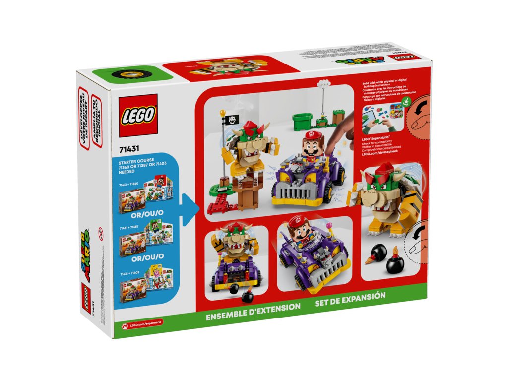 - Aplikace LEGO® Super Mario™ – Stáhněte si aplikaci s návody na sestavení Bowserova auta, inspirativními tipy a spoustou dalšího. Seznam kompatibilních zařízení s operačním systémem Android a iOS najdete na stránce LEGO.com/devicecheck