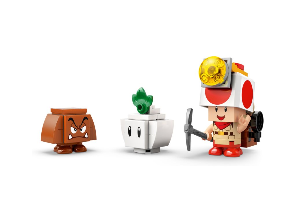 - 3 figurky LEGO® Super Mario™ pro zábavné hraní – Tato stavebnice Nintendo® LEGO obsahuje Captain Toada, turnip a figurku Goomby, sestavitelný batoh a doplněk v podobě krumpáče, pánve a diamantů