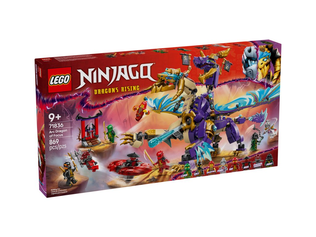 Potěšte kluky a holky od 9 let nindžovskou stavebnicí LEGO® NINJAGO® (71836) Drak soustředění Arc, se kterou si připomenou napínavé akční scény z 3. řady televizního seriálu NINJAGO Dračí povstání. Tato stavebnice obsahuje figurku dvouhlavého draka s pohyblivým ocasem, nohama, chodidly, hlavou, krkem, čelistí a drápy. Děti můžou aktivovat vystřelovač v jeho hrudi a pohybovat jeho velkými fóliovými křídly tam a zpět pomocí páky, která je umístěna na jeho zádech.