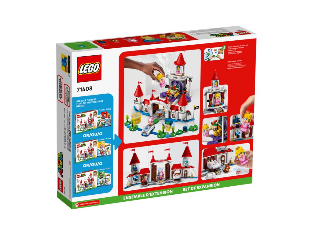 Dopřejte dětem možnost doplnit herní svět LEGO® Super Mario™ o kultovní lokaci díky rozšiřujícímu setu Hrad Peach (71408). Hráči mohou prozkoumávat nespočet prvků a nejrůznějšími způsoby sbírat digitální mince s interaktivními figurkami LEGO® Maria, LEGO® Luigiho nebo LEGO® Peach™ (nejsou součástí setu). Součástí modelu je trůnní sál s otočnou zdí, za kterou se ukrývá Bowser, vitrážové okno s princeznou Peach, obraz Bob-omb s akčním prvkem, dort ukrývající Goombu, speciální potrubí , kostka času, „rozbitý“ most, mísa s fialovým ovocem a mnoho dalšího. (Poznámka: Pro plnohodnotný interaktivní herní zážitek je vyžadován startovací set 71360, 71387 nebo 71403.)