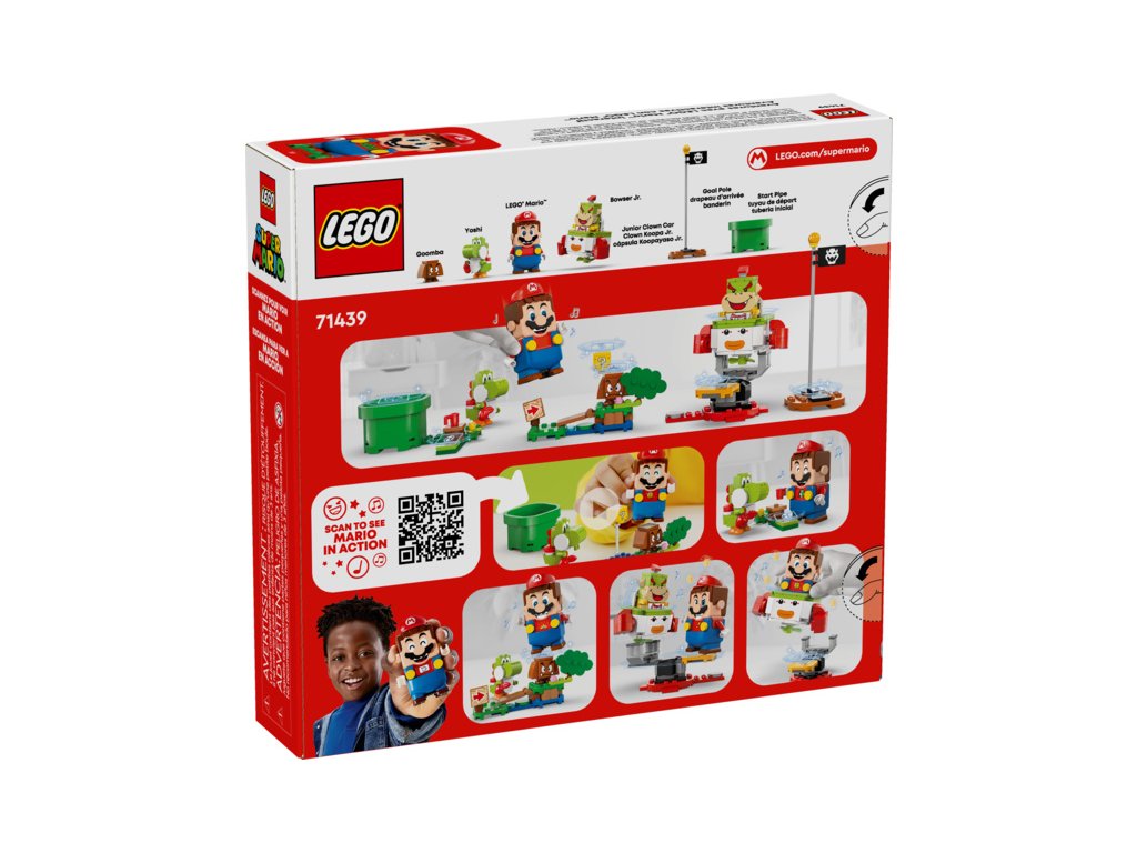 Tento set LEGO® Super Mario™ (71439) dětem poskytne hodiny dobrodružství s interaktivním LEGO® Mariem, při kterých zažijí třeba bitvu o klaunské auto Bowsera Jr. Set je parádní dárek Nintendo® pro kluky, holky a hráče od 6 let a obsahuje interaktivní figurku LEGO Maria a figurky Bowsera Jr., Goomby a Yoshiho, a k tomu navíc 3 modely prostředí. Cestujte od startovacího potrubí k cílové vlaječce, spouštějte digitální reakce od LEGO Maria a cestou sbírejte mince. Pozdravte Yoshiho, porazte Goombu,dupněte na akční kostku s otazníkem, svrhněte Bowsera Jr. a pak odfrčte v jeho Junior Clown Car.