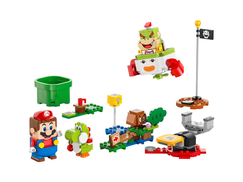 - Dobrodružný set – Začněte na startovacím potrubí, pozdravte Yoshiho, porazte Goombu, dupněte na akční kostku s otazníkem, podejte si Bowsera Jr. a doběhněte k cílové vlaječce