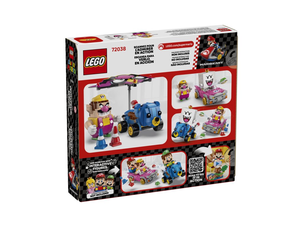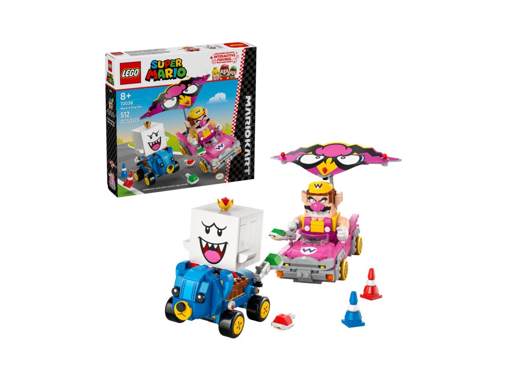 Závoďte, driftujte, létejte a bojujte s tímto setem LEGO® Super Mario™ (72038) Mario Kart™ – Wario a King Boo. Set představuje zábavný dárek pro kluky, holky a obecně gamery od 8 let a obsahuje 2 figurky LEGO Super Mario, modely oblíbených vozidel Badwagon a Teddy Buggy z kostek a 2 dopravní kužely. Každá motokára má funkci vystřelování krunýřů a driftování a Badwagon má odnímatelný kluzák, který lze připojit i k Teddy Buggy.