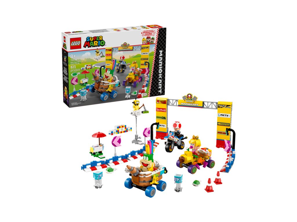 - Nintendo® postavička jako dárek – Postavte si dráhu a vozidla Mario Kart™ a závoďte (a udělejte si přestávku na zmrzlinu) se setem LEGO® Super Mario™: Mario Kart – Baby Peach a sada Grand Prix