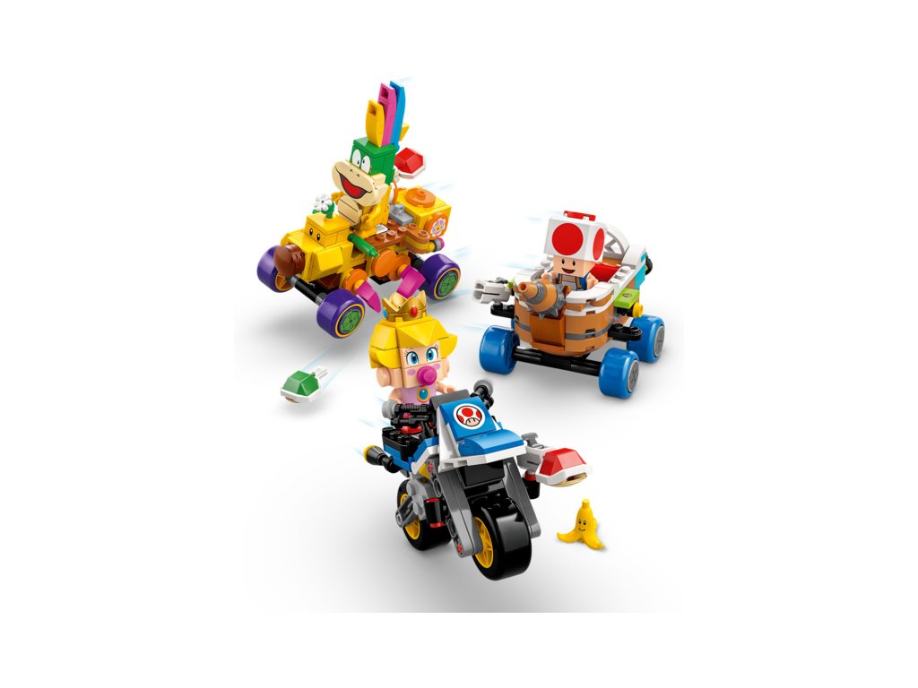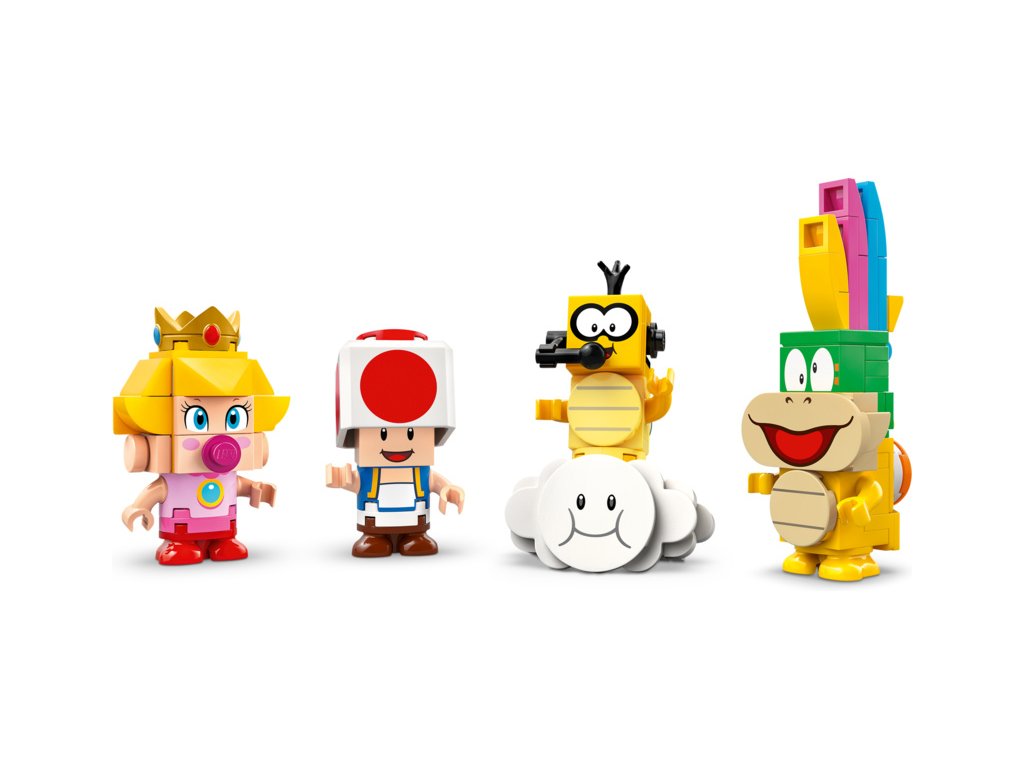 Set obsahuje figurky Baby Peach, Lakity, Lemmyho a Toada. Přidejte figurku LEGO® Mario™, LEGO® Luigi™ nebo LEGO® Peach™ (ze setů 71439, 71440 nebo 71441 – prodávají se samostatně) a užijte si interaktivní hraní s parádními digitálními reakcemi přiřízení vozidel nebo při umístění na 2 Item Boxes nebo na Akční prvky jiných modelů.