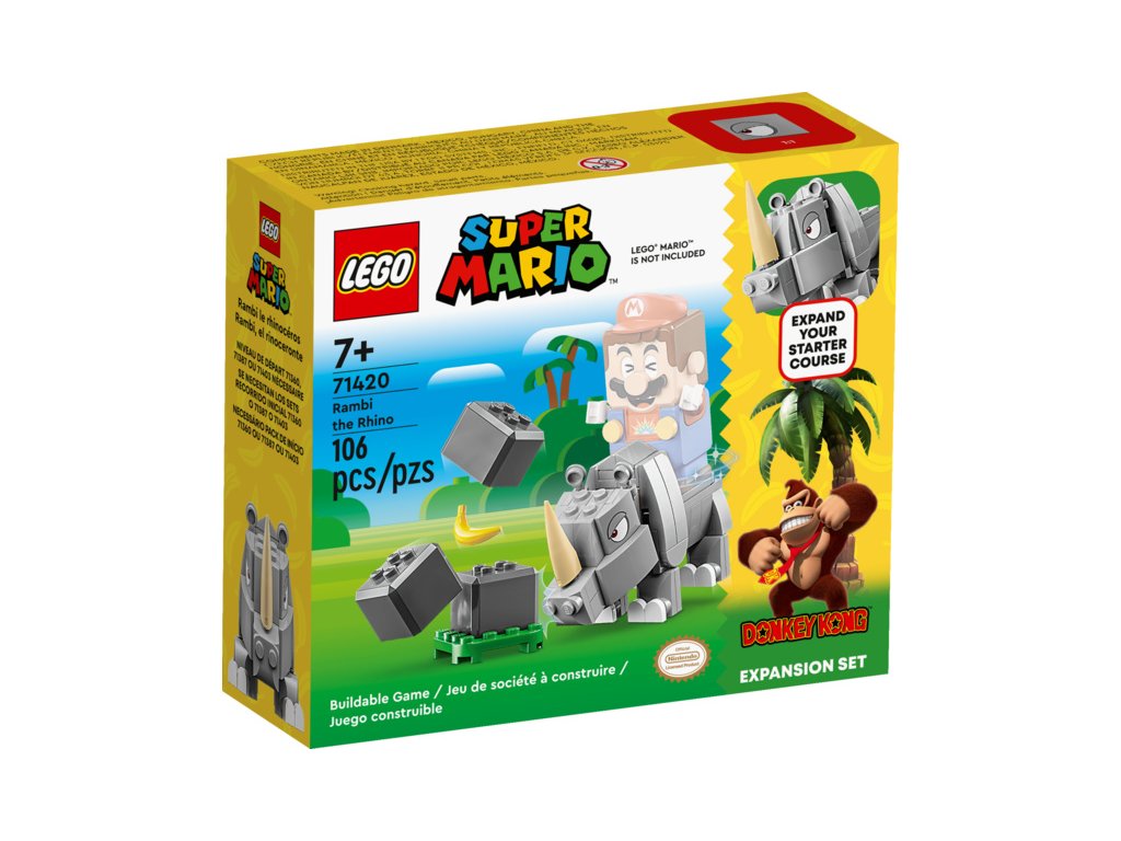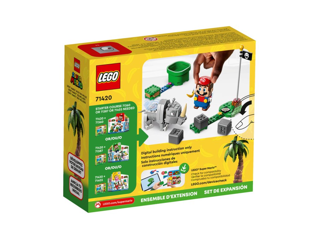 Připravte se na dobrodružství s rozšiřujícím setem LEGO® Super Mario™ (71420) Nosorožec Rambi – rozšiřující set pro děti od 7 let. Obsahuje figurku Rambiho z kostek LEGO®, na které mohou jezdit interaktivní figurky LEGO® Mario™, LEGO® Luigi™ nebo LEGO® Peach™ (nejsou součástí balení). Když Rambi chodí, běží proti vrstvitelným prvkům kamenů a jinak se hýbe, aktivují se zvukové efekty interaktivní figurky. Poznámka: Pro interaktivní herní zážitek je zapotřebí některý ze startovacích setů 71360, 71387 nebo 71403.