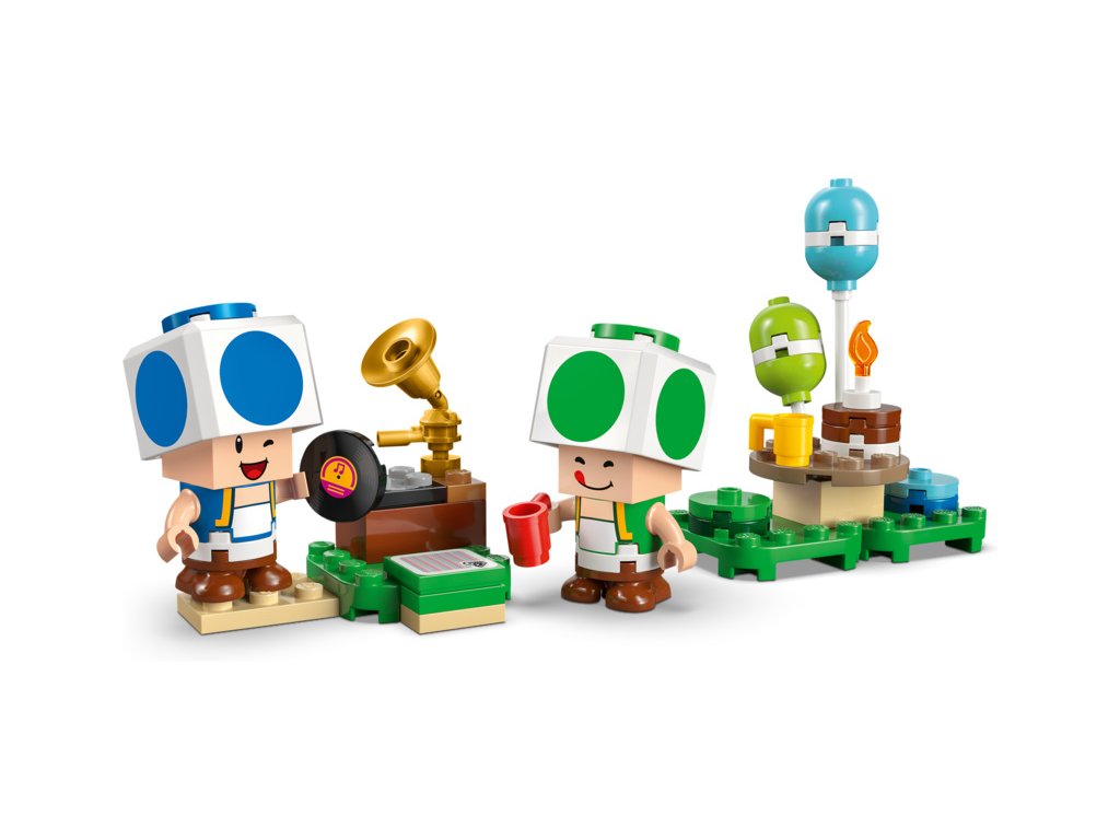 - Čas na oslavu – V domku Toada najdet kuchyň a ložnici (s obrazem Peachina hradu) a odnímatelný nábytek pro snadné hraní. Stavebnice obsahuje také piknikový stůl, gramofon a doplňky na oslavu