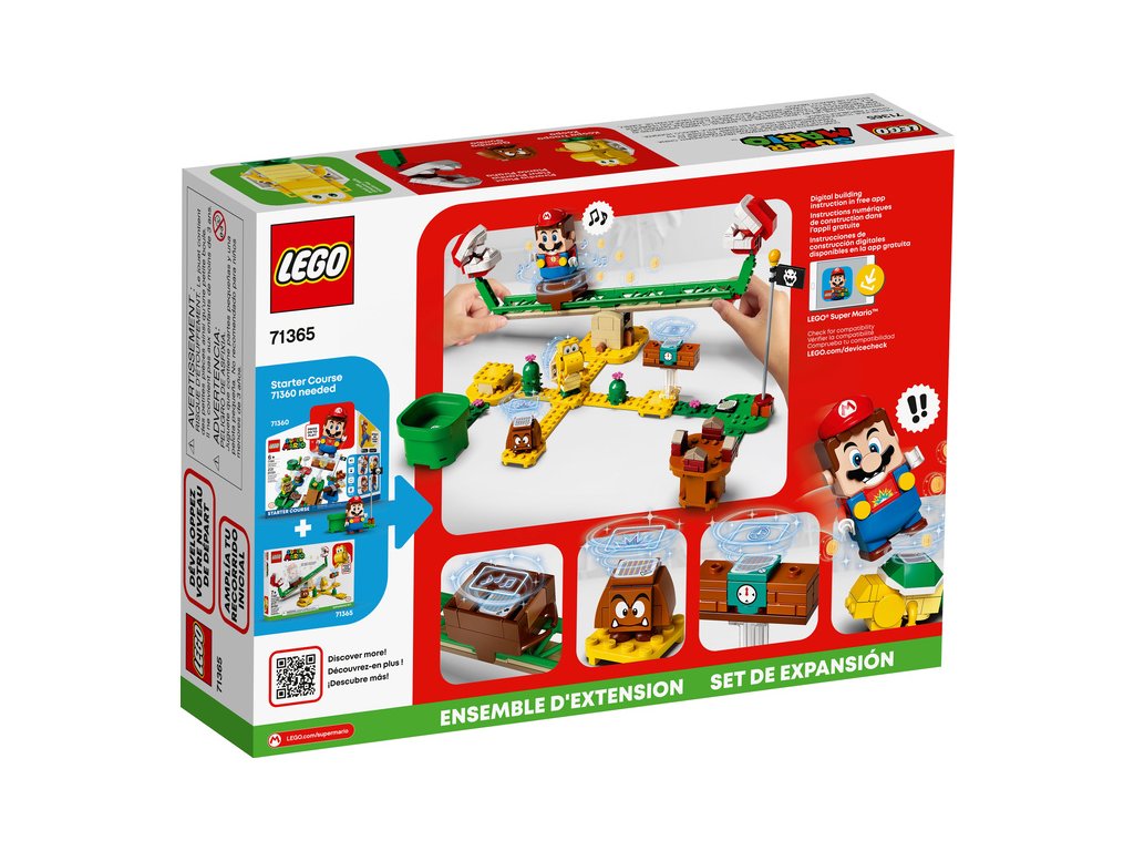 Fanoušci obohatí svůj svět LEGO® Super Mario™ o houpačku s piraněmi a pokusí se v tomto rozšířujícím setu (71365) získat co nejvíce mincí. Součástí této sběratelské stavebnice je houpačka s piraňovými rostlinami na každé straně, časová kostka, díky které může LEGO® Mario™ (figurka není součástí balení) hrát déle, a nepřátelé Goomba a Koopa Troopa. Tato stavebnice přidává spoustu nových herních možností k startovacímu setu Dobrodružství s Mariem (71360), ve kterém je figurka LEGO Mario. Jedná seo skvělý narozeninový dárek pro děti. Stavebnice LEGO Super Mario přivádí legendární postavičku do reálného světa. Startovací set, sety rozšiřující a doplňkové balíčky umožňují fanouškům tvořit své vlastní jedinečné úrovně.