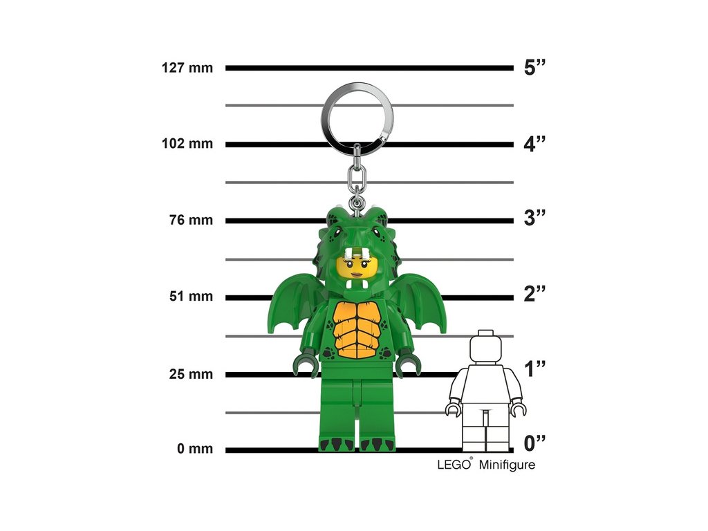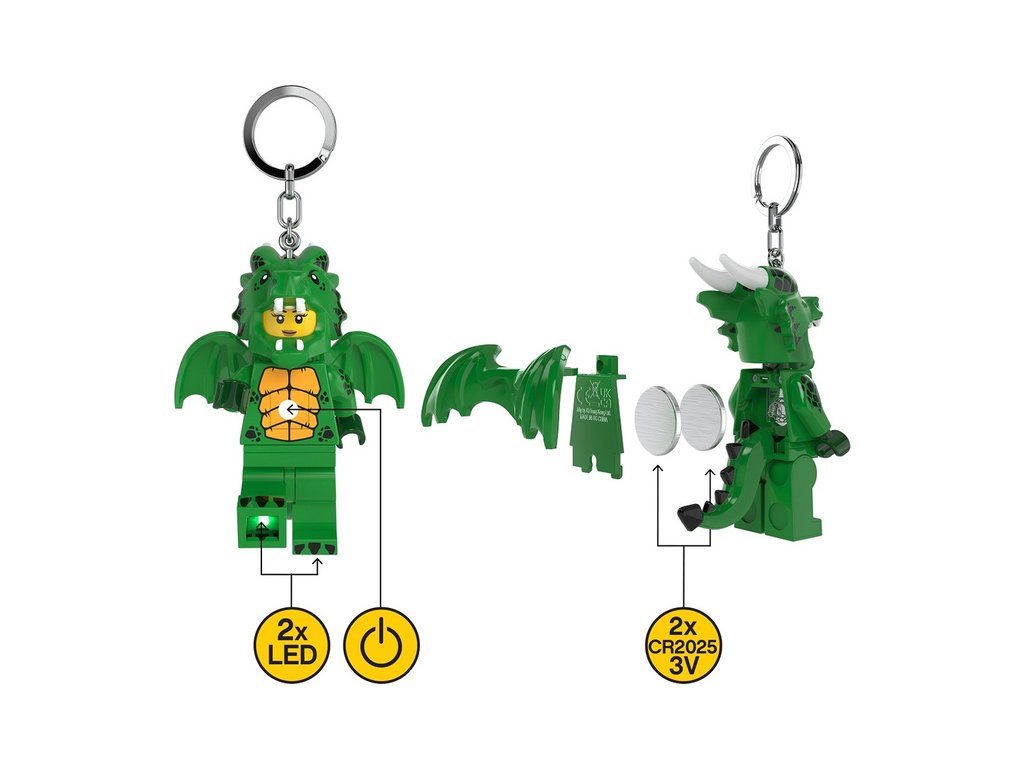 Figurka Zelená dračice jako LED svítící přívěšek na batoh nebo klíče. Sběratelské LEGO postavičky s tlačítkem na hrudi a LED diodami v nohách nesmí chybět ve Vaší sbírce LEGO figurek! Výška figurky je 7,5 cm. Baterie součástí balení. Doporučený věk: 6+.