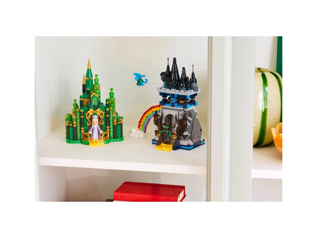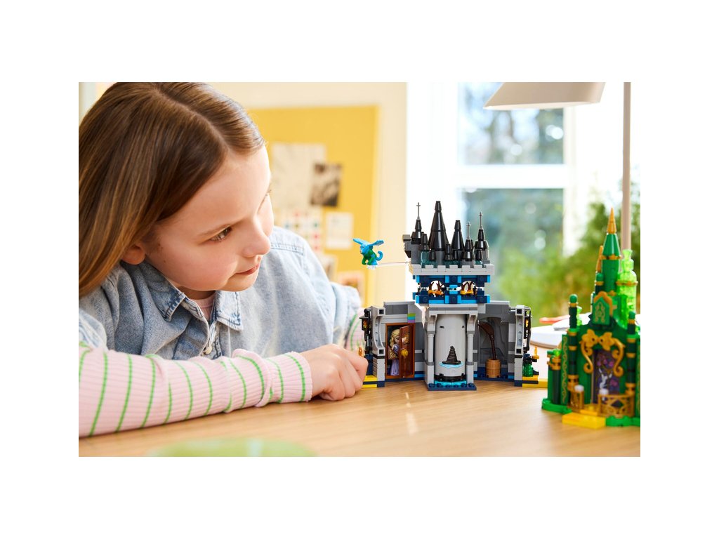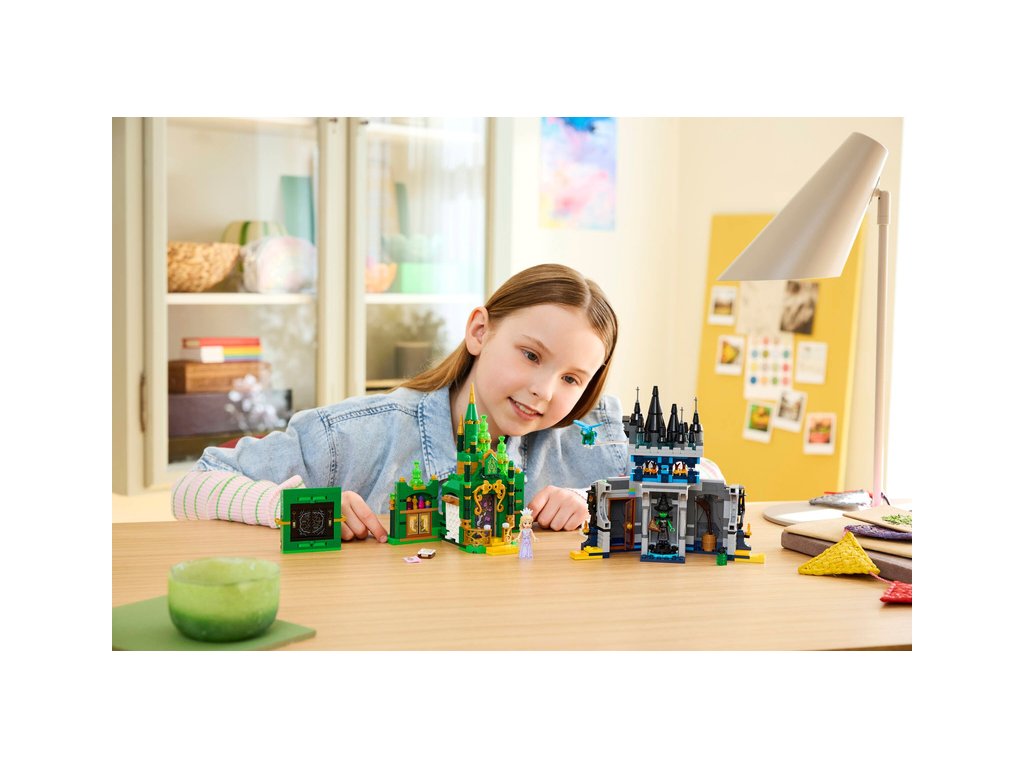 Tato stavebnice poslouží jako jedinečný dárek. Spolu s minipanenkami Glindy a Elphaby se jedná o první stavebnici LEGO® Wicked, která obsahuje figurku létající opice. Děti s postavami prozkoumají dva propracované modely a objeví všechny detaily, které se v nich skrývají. Odpočinou si v pokoji v Emerald City nebo si prohlédnou skrytou mapu země Oz. V modelu zámku Kiamo Ko si přečtou Grimmerii nebo pomůžou Elphabě zmizet v tajném místnosti a následovat svůj osud za hranicemi duhy z kostek LEGO!