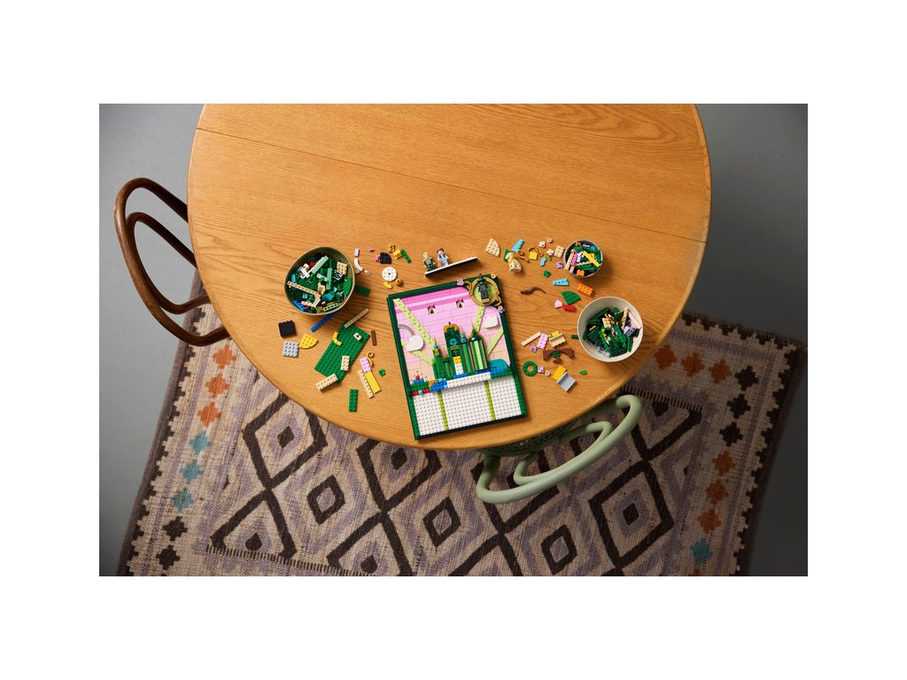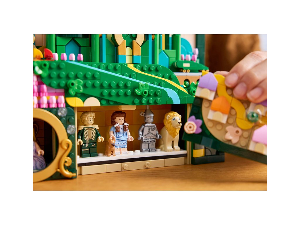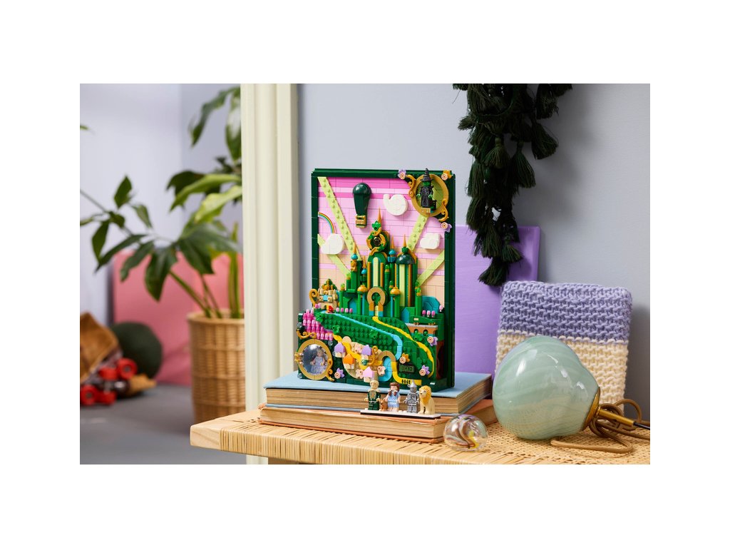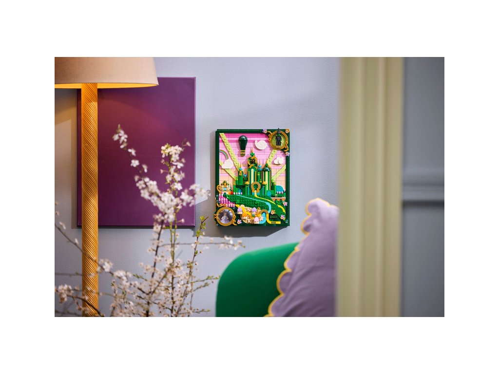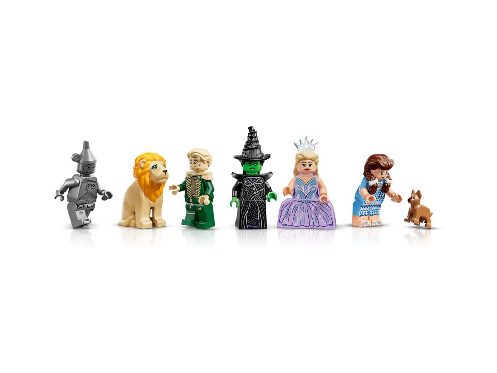 - 7 postav a minifigurek – Toto umělecké dílo LEGO® zobrazuje Elphabu letící nad Emerald City, Glindu vznášející se v bublině a nechybí Dorotka Galeová, Zbabělý lev, Strašák, Plecháč a pes Toto