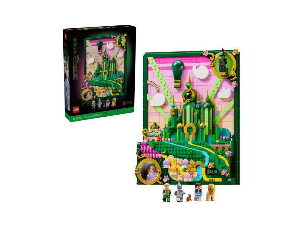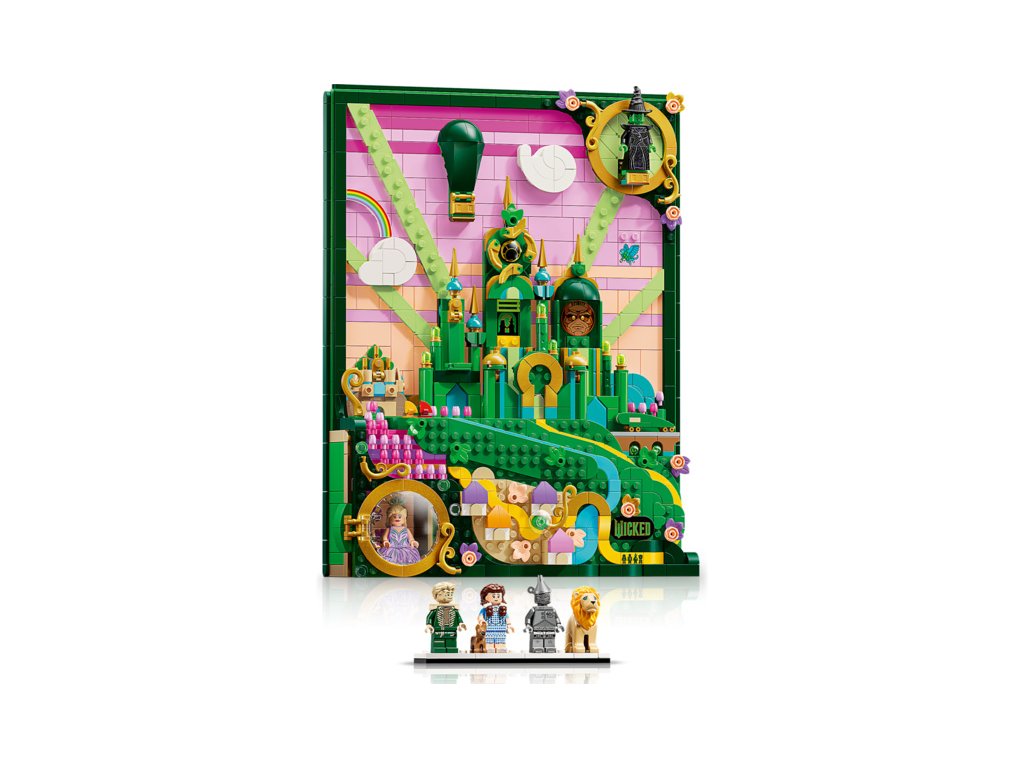 - Výstavní kousek na motivy filmu Wicked na zeď nebo na polici – Tato stavebnice se skládá z 1 518 dílků a měří přes 32 cm na výšku, 25 cm na šířku a 8 cm do hloubky