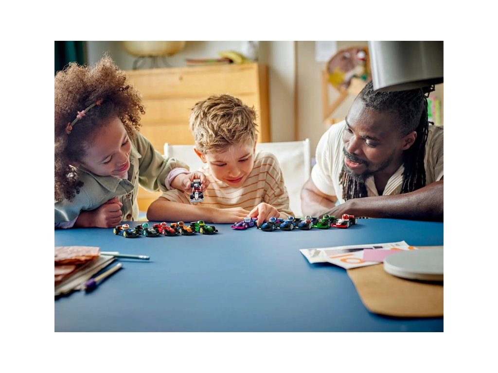 - Pohyblivá kola – Každé vozidlo LEGO® je dodáváno s helmou F1® v kokpitu a pohyblivými koly, aby si děti mohly uspořádat vlastní závody.