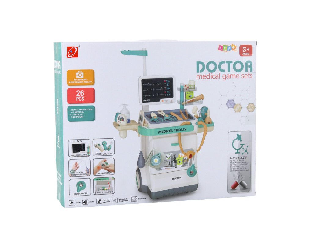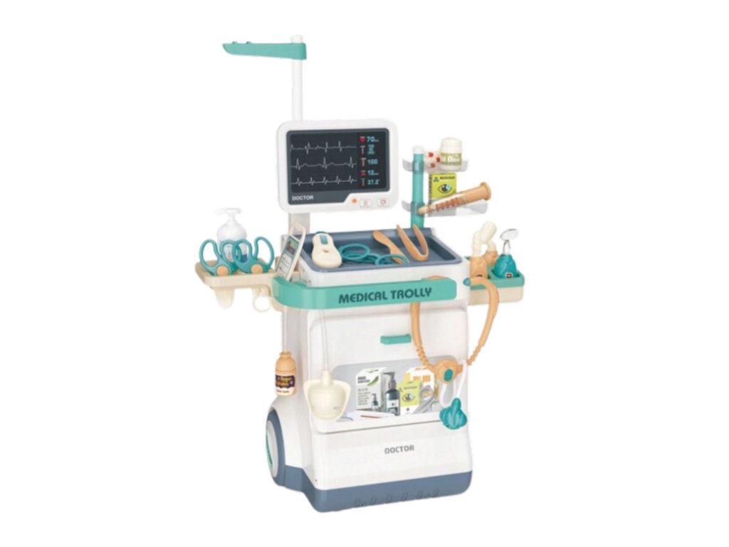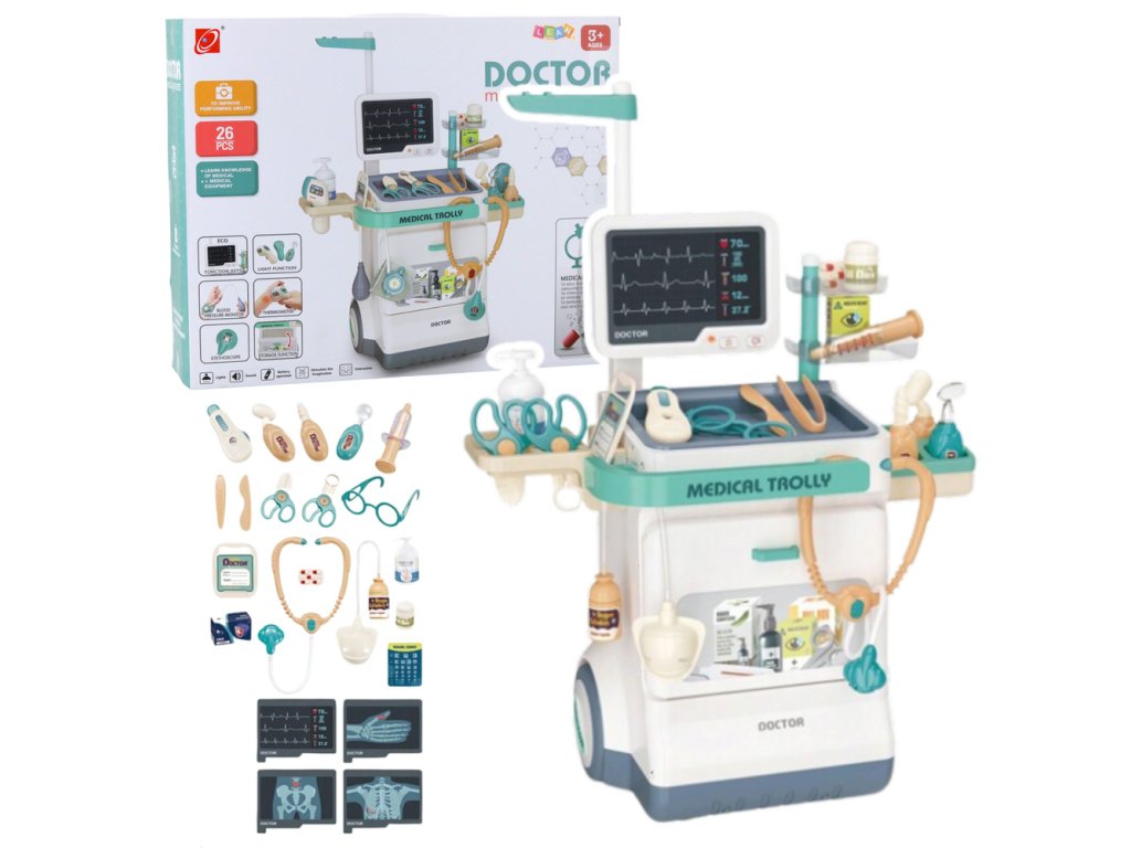 Lékařská sada zdravotnického vozíku je unikátní vzdělávací hračka, která dětem umožňuje hrát si na lékaře a učit se základním lékařským nástrojům. Díky velkému počtu dílků – 26 doplňků – mohou děti provádět vyšetření, pečovat o pacienty a hrát si lékařské scénáře. Vozík má moderní design a jeho praktická konstrukce usnadňuje ukládání veškerého příslušenství a přemisťování sady.