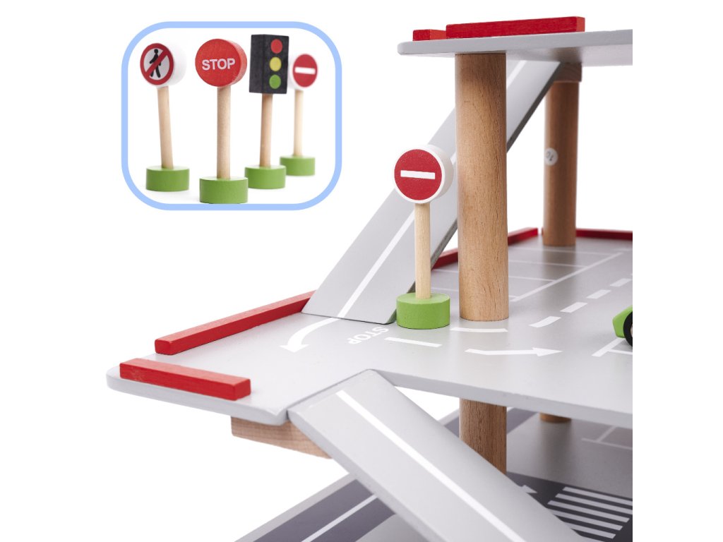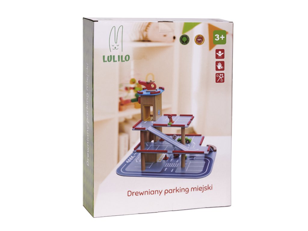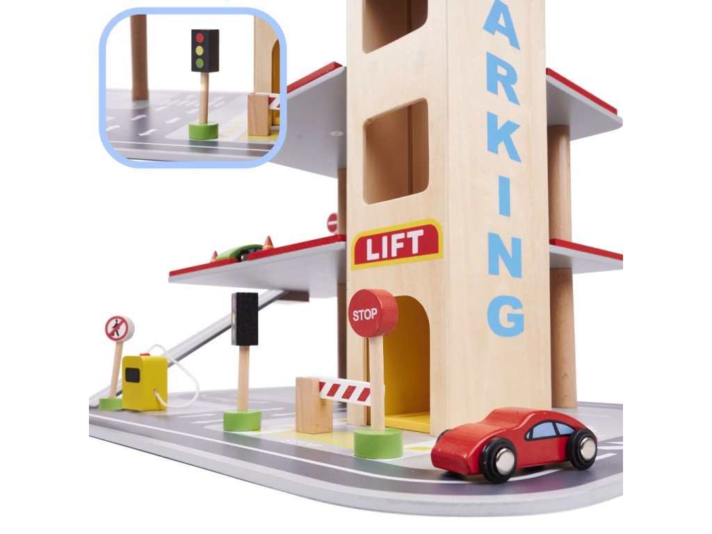 Tři parkovací patra umožní zaparkovat nejen přiložená dřevěná autíčka, ale i další vozidla z dětské sbírky.