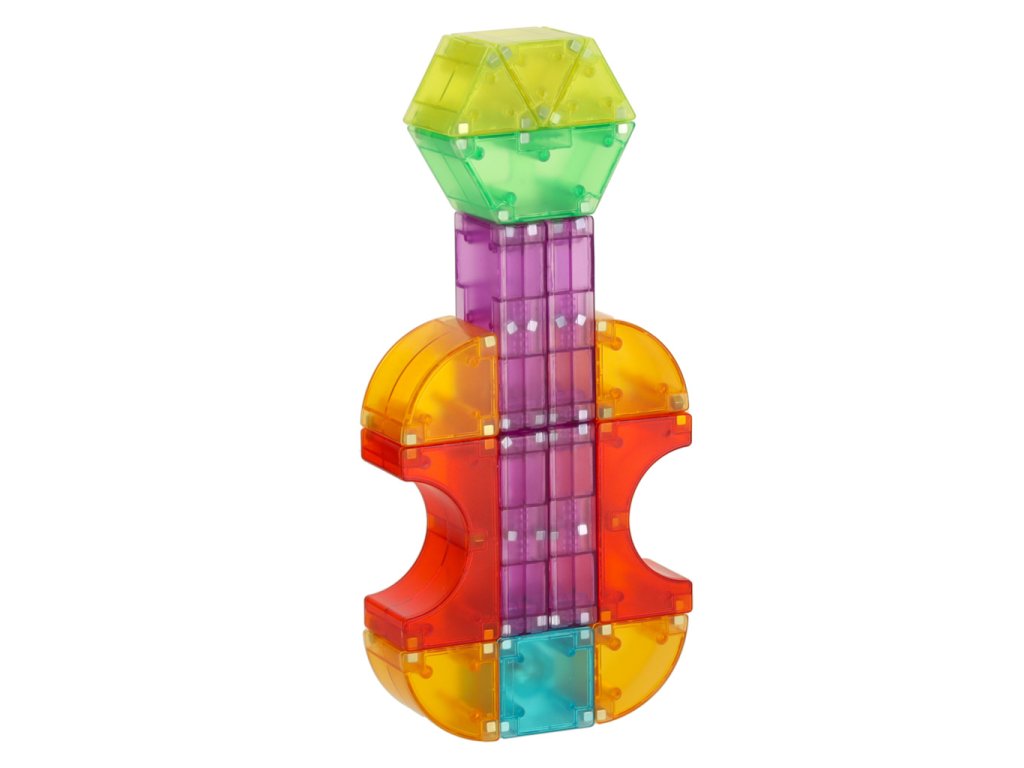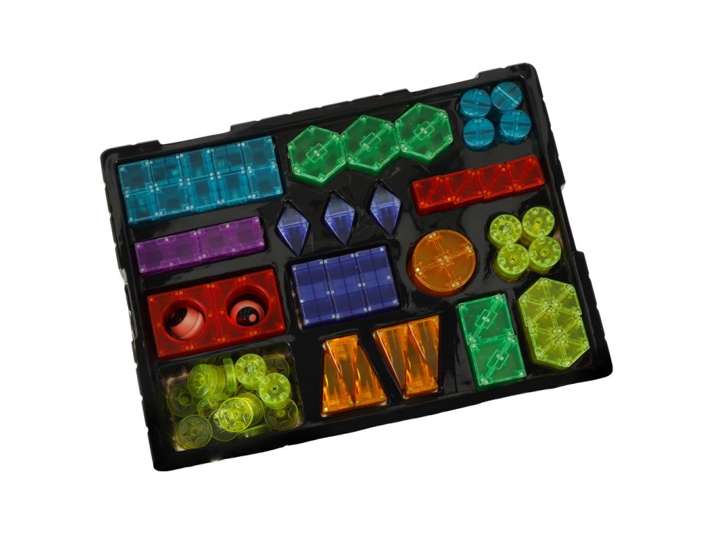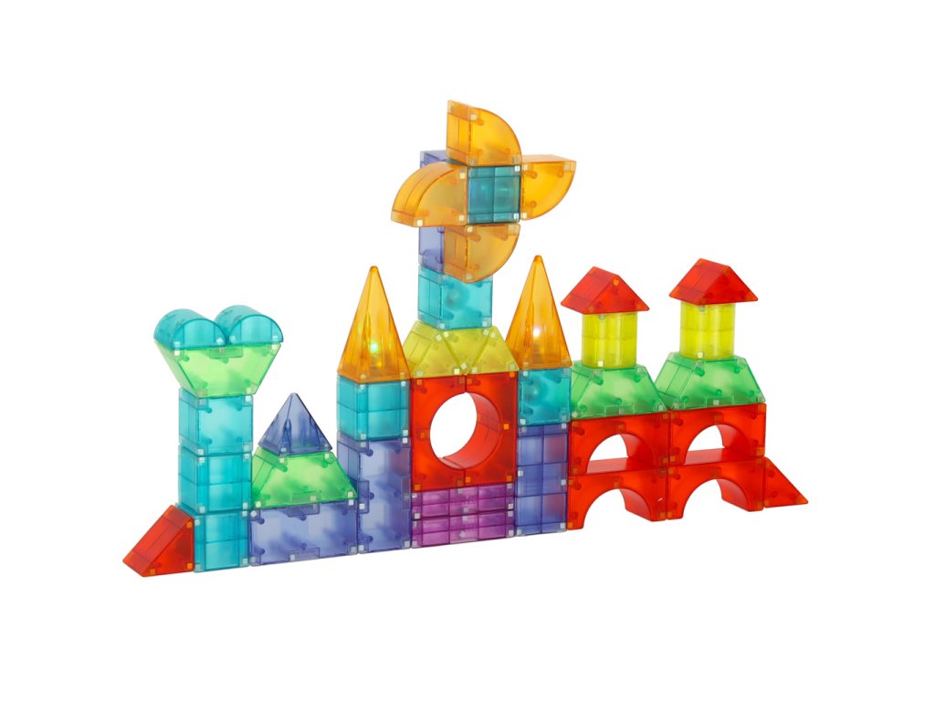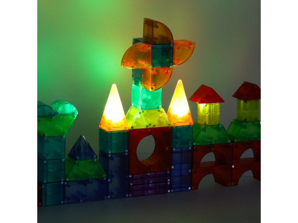 Sada barevných magnetických stavebních kostek obsahuje 134 kusů různých barev a tvarů, které se spojují pomocí magnetů. Díky bateriovému napájení kostek (baterie jsou součástí sady) může každá stavba svítit ve tmě. Hračka podporuje učení rozpoznávání barev a tvarů a rozvíjí manuální dovednosti. Určeno pro děti od 3 let.