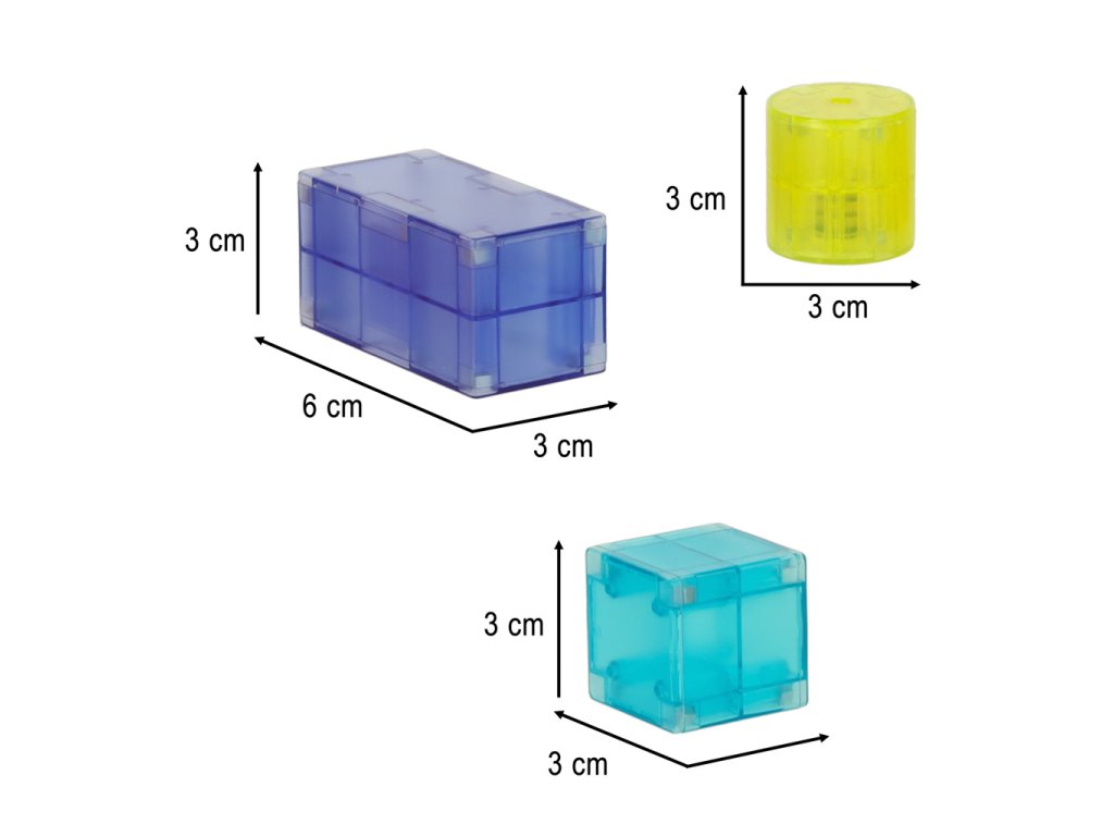 - Rozměry největšího kostky: 6 cm x 3 cm x 3 cm