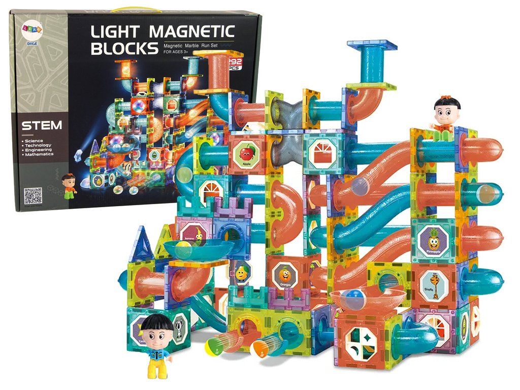 Magnetická dráha se svítícími kuličkami je kombinovaná hračka spojující stavebnici z magnetických bloků a skluzavku pro kuličky. Děti mohou vytvářet různé dráhy, rampy, smyčky a překážky, čímž rozvíjejí kreativitu, logické myšlení a jemnou motoriku.