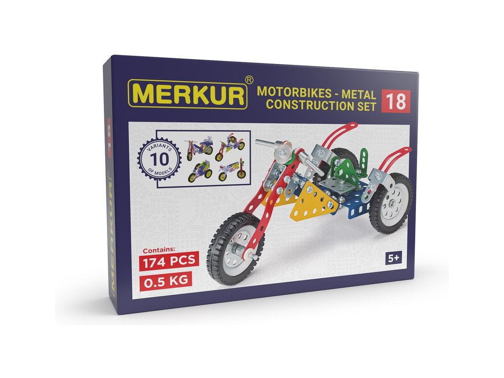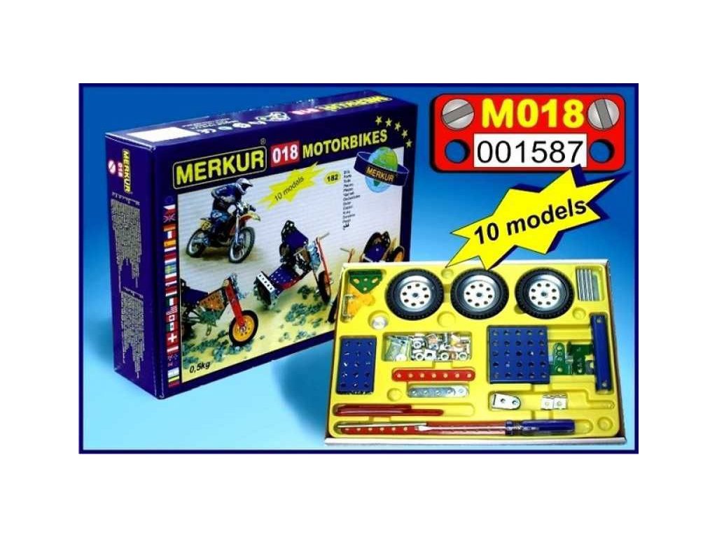 Z této jednovrstvé stavebnice Merkur 018 Motocykly lze dle návodu sestavit až 10 různých modelů terénních motocyklů. Malí konstruktéři mohou sestavit i model dle svých představ, fantazii se meze nekladou. Stavebnice obsahuje 174 dílků. Vhodné i pro děti, které s Merkurem začínají. Se sestavenými modely si lze hrát, jsou velmi odolné.