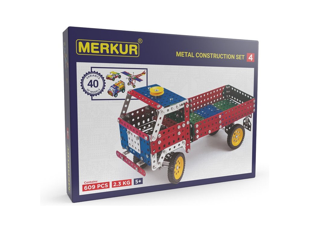 Dvouvrstvá klasická velká stavebnice Merkur 4 obsahuje mimo základní sestavu dílů také součástky nutné pro stavbu nákladních automobilů, formulí a letadel. Součástí stavebnice je samozřejmě velká návodová knížka s návodem na stavbu 40 různých modelů jako je nákladní automobil, lunochod, buggy, formule, jeřáb atd. Se sestavenými modely si lze hrát, jsou velmi odolné.