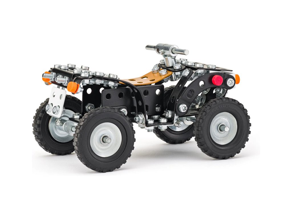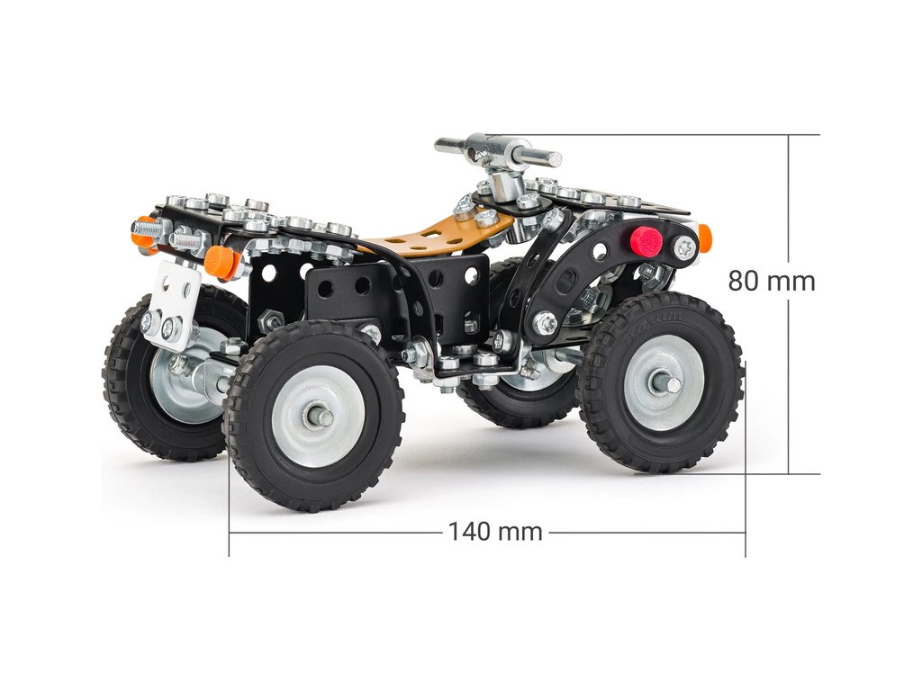 Klasická česká stavebnice Merkur - Čtyřkolka. V balení najdete podrobný návod, Merkur sadu nářadí a unikátní Merkur díly. Merkur díly jsou univerzální a tak vás neomezí v jakékoli modifikaci a nápadu. Stavebnici tak můžete sestavit podle návodu nebo podle svých představ.
