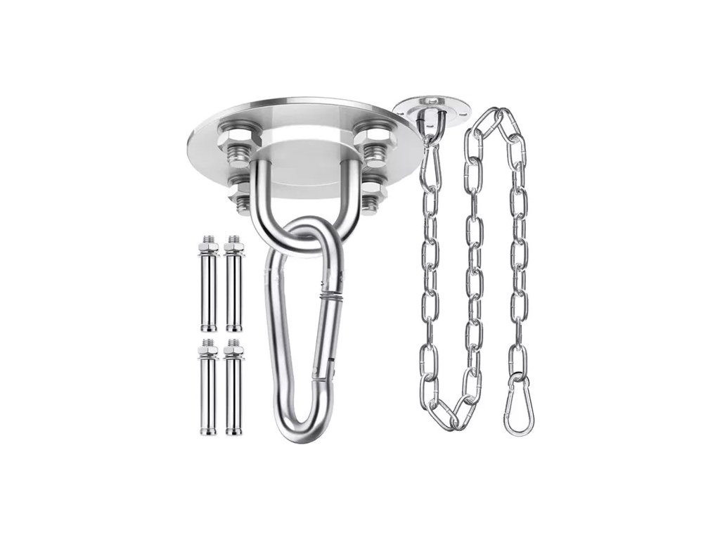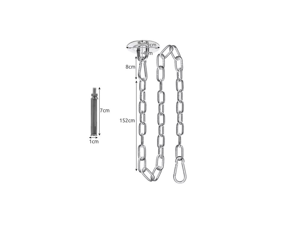 - Sada obsahuje pevné prvky: karabiny, rozpěrné kotvy, pevný a dlouhý řetěz a stropní držák.