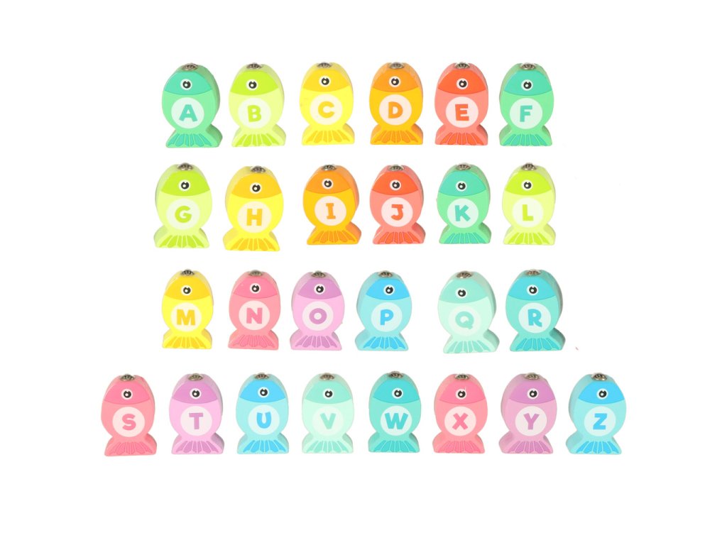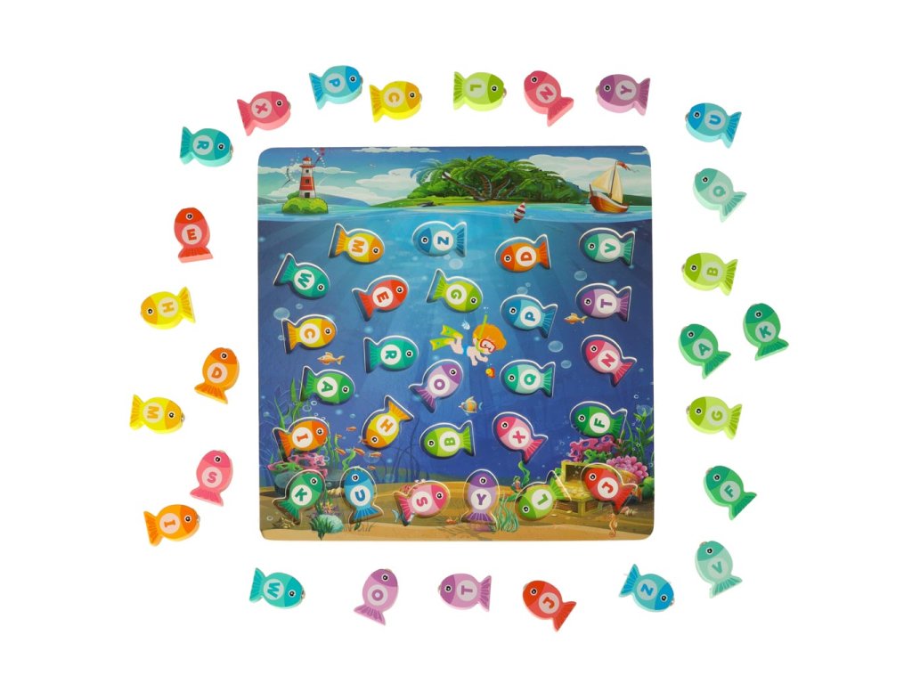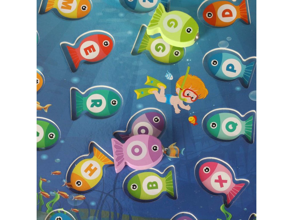 Na každé rybce bylo umístěno jedno z písmen abecedy odpovídající , každá rybka do příslušného otvoru.
