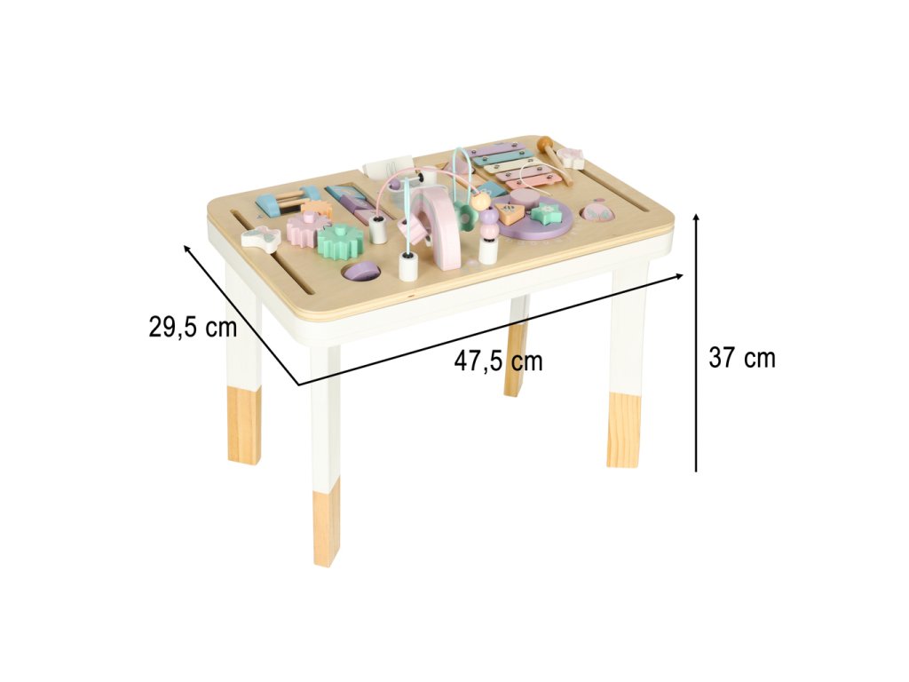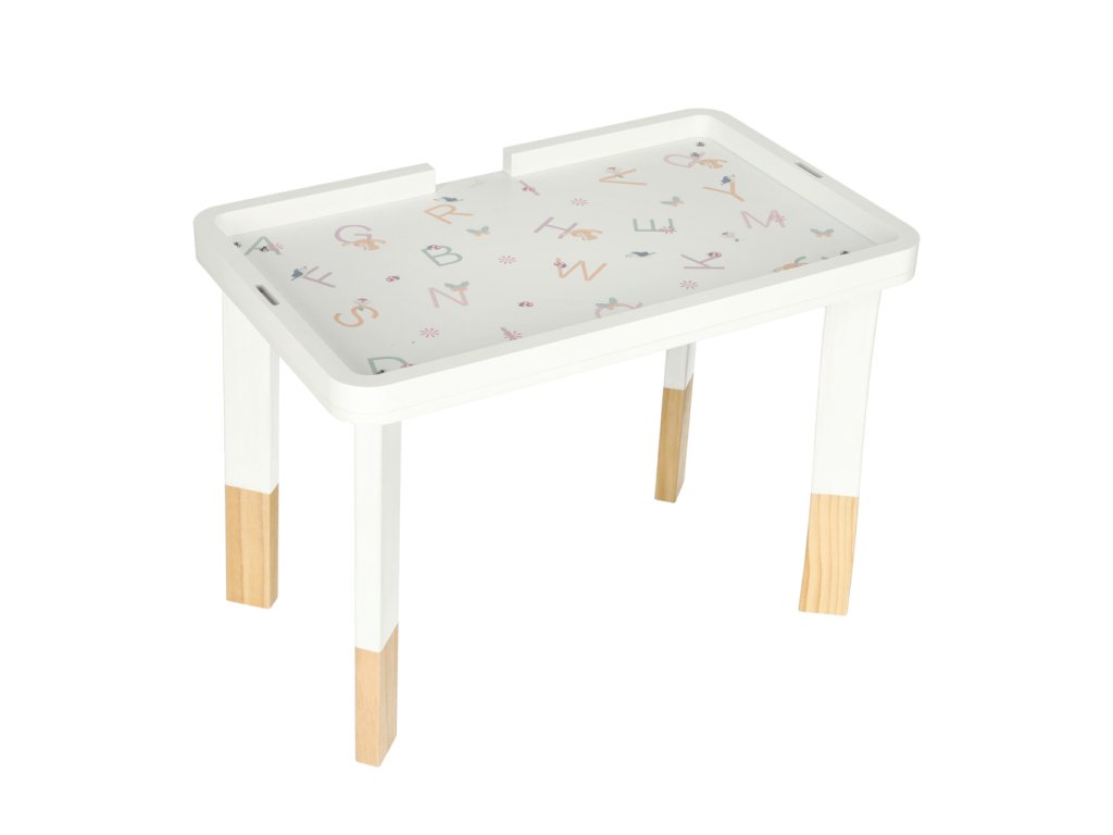 Vrchní desku (47,5 x 29,5 cm) lze odejmout, čímž se stůl promění v místo, kde si děti mohou kreslit nebo si hrát s kinetickým pískem. Stůl není jen vzdělávacím kusem nábytku, ale také jedinečnou dekorací dětského pokoje — pastelové barvy a okouzlující kresby vytvářejí útulnou atmosféru a podporují kreativní hru. S výškou 37 centimetrů je stůl dokonale přizpůsoben potřebám nejmenších.